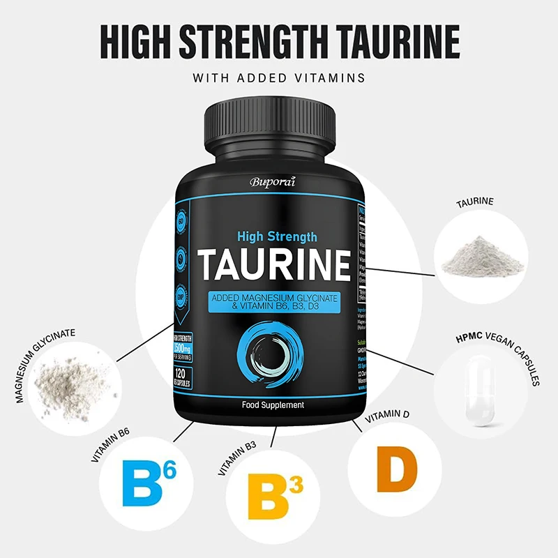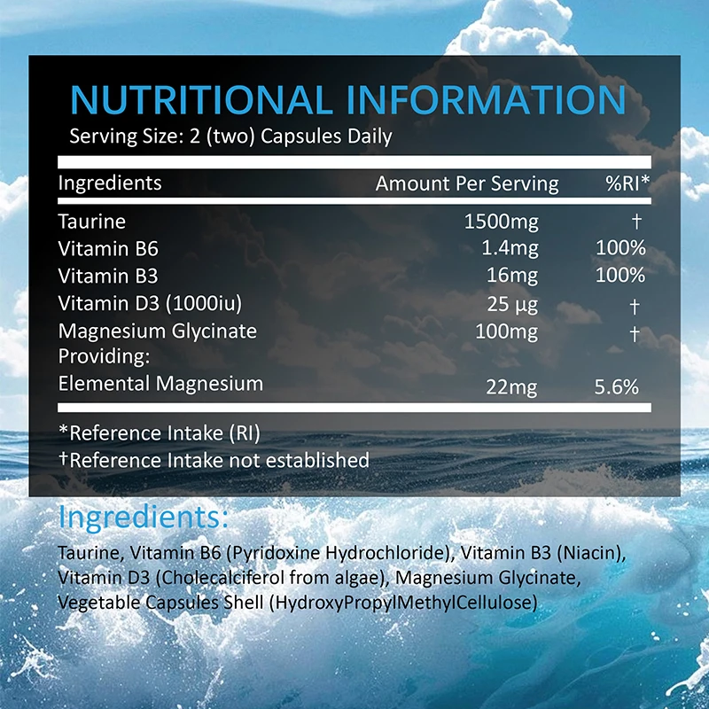 ✅ Taurine Supplement - Each 2 capsules provides 1500 mg of taurine, 100 mg of magnesium glycinate, 1,000 IU of vitamin D3, and 100% NRV of daily vitamins B6 and B3.