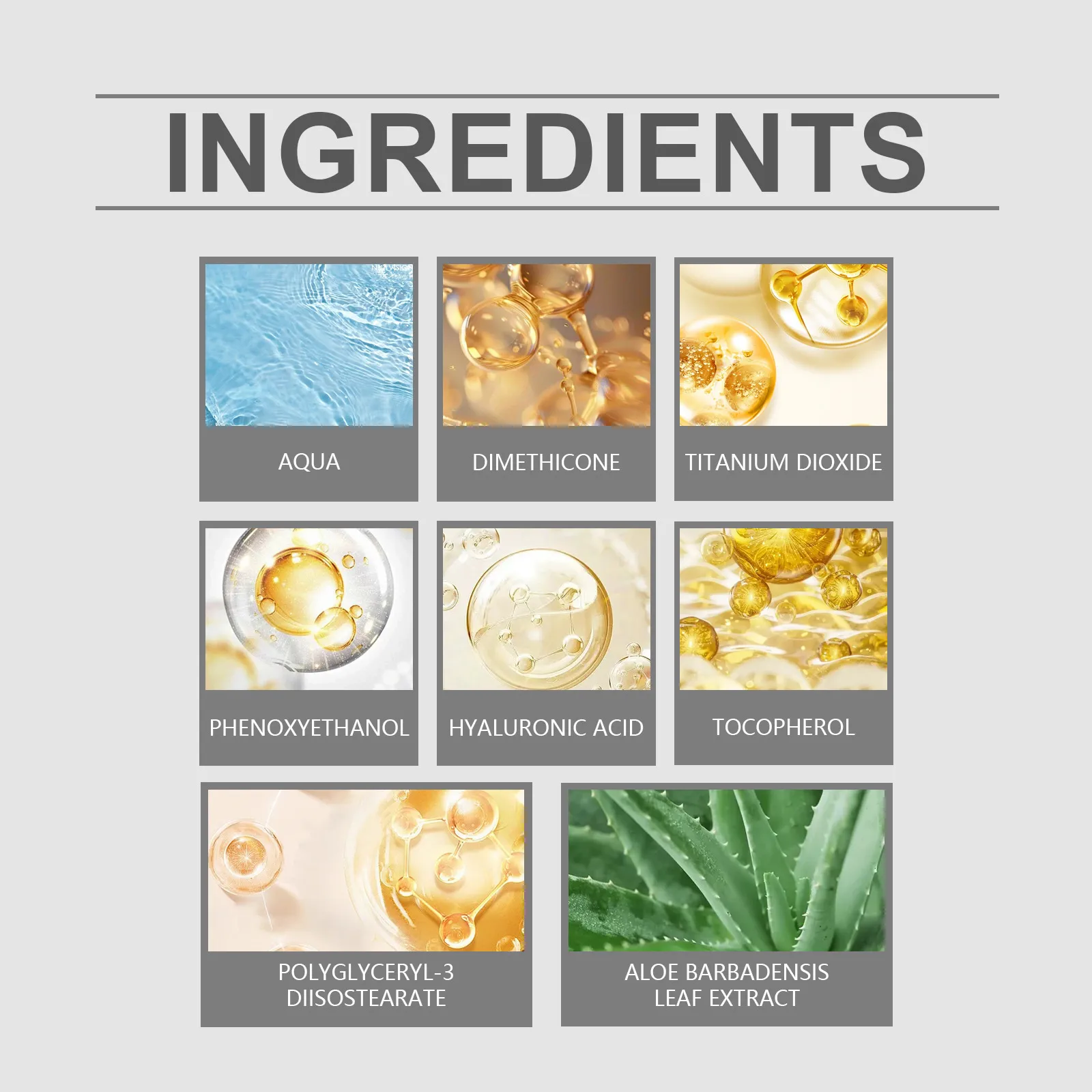 Ingredients: Water, polydimethylsiloxane, polyglycerol-3 diisostearate, titanium dioxide, phenoxyethanol, aloe extract, hyaluronic acid,