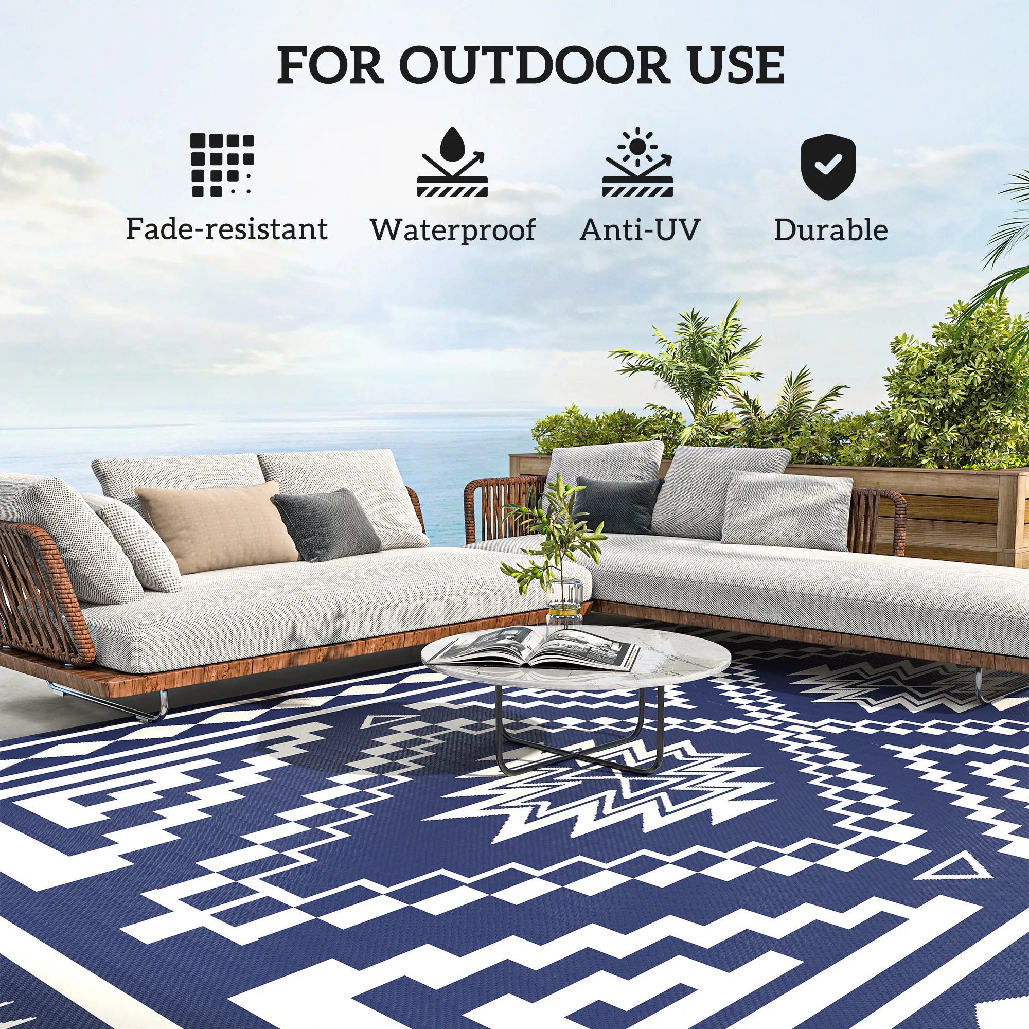 Camp on a carpet with Outsunny. This porch rug is designed to handle dirt. Outdoor-ready, our rug really cleans up fast; sweep, spray, wipe, or wave it; its powerful polypropylene fibers stay dry and don't saturate. Keep an outdoor rug in the camper, RV, or car; it's excellent for camping, beach trips, patio picnics, or anywhere outside. The color is reversible, meaning you can flip our plastic rug over for a fresh side or style. Upholster the outdoors with Outsunny. Features: - Reversible with double sides for varied use - Made of polypropylene, with a protective coating to help prevent fading and sun damage - Features robust edging to prevent fraying - Space-saving foldable design for easy storage and transport - Carry bag included - Versatile for camping, picnics, RV road tours, and more Specification: - Color: Blue and White - Style: Square Patchwork - Materials: 310g/m² Polypropylene, Non-Woven Fabric - Dimensions: 215.7" L x 107.9" W - Carry Bag Dimensions: 36.6" L x 13.4" W x 7.5" H - Item Label: 84J-063V00BU - Note: Not fireproof, keep away from fire Package Includes: - 1 x Outdoor Rug - 1 x Carry Bag Camp on a carpet with Outsunny. Features: - Reversible with double sides for varied use - Made of polypropylene, with a protective coating to help prevent fading and sun damage - Features robust edging to prevent fraying - Space-saving foldable design for easy storage and transport - Carry bag included - Versatile for camping, picnics, RV road tours, and more Specification: - Color: Black and Gray - Style: Square Patchwork - Materials: 310g/m² Polypropylene, Non-Woven Fabric - Dimensions: 215.7" L x 107.9" W - Carry Bag Dimensions: 36.6" L x 13.4" W x 7.5" H - Item Label: 84J-063V00GY - Note: Not fireproof, keep away from fire Package Includes: - 1 x Outdoor Rug - 1 x Carry Bag Camp on a carpet with Outsunny. Features: - Reversible with double sides for varied use - Made of polypropylene, with a protective coating to help prevent fading and sun damage - Features robust edging to prevent fraying - Space-saving foldable design for easy storage and transport - Carry bag included - Versatile for camping, picnics, RV road tours, and more Specification: - Color: Black and White - Style: Square Patchwork - Materials: 310g/m² Polypropylene, Non-Woven Fabric - Dimensions: 215.7" L x 107.9" W - Carry Bag Dimensions: 36.6" L x 13.4" W x 7.5" H - Item Label: 84J-063V00WT - Note: Not fireproof, keep away from fire Package Includes: - 1 x Outdoor Rug - 1 x Carry Bag.