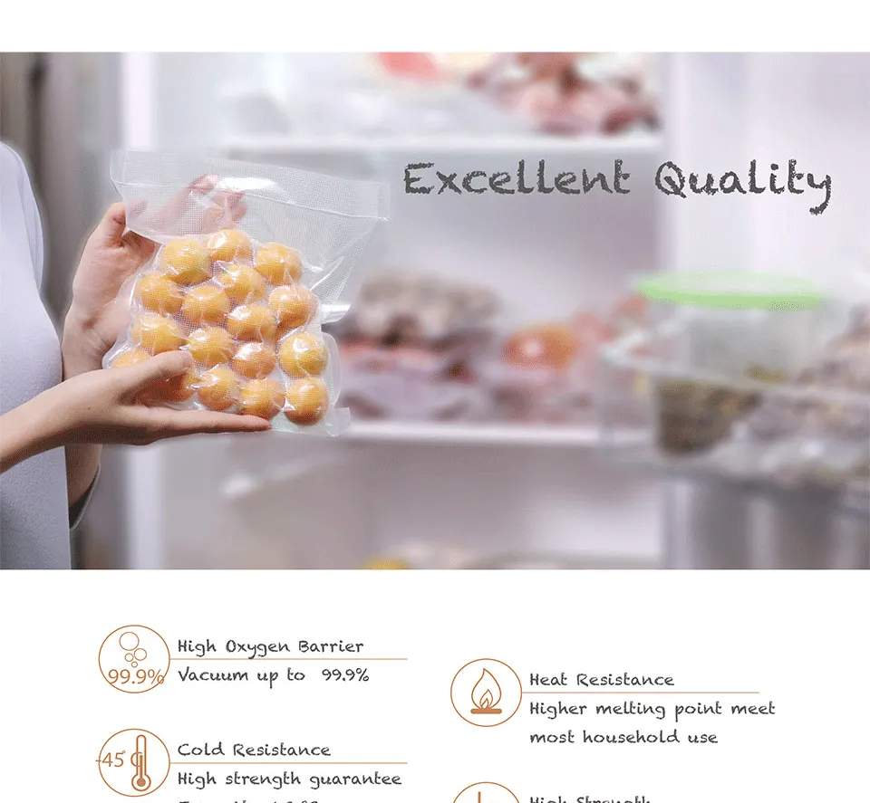 In the fast-paced world of modern kitchens, preserving food efficiently and for longer periods is essential for reducing waste and ensuring freshness. The Textured Roll Bag Food Transparent Plastic Thread Reticulated Air Pumping Fresh-Keeping Packaging Vacuum Bag is the perfect solution for keeping your food fresh, organized, and protected. Whether you're storing raw ingredients, cooked meals, or even household items, this vacuum bag ensures your food remains safe from moisture, air, and freezer burn, extending its shelf life and preserving its flavor and texture.