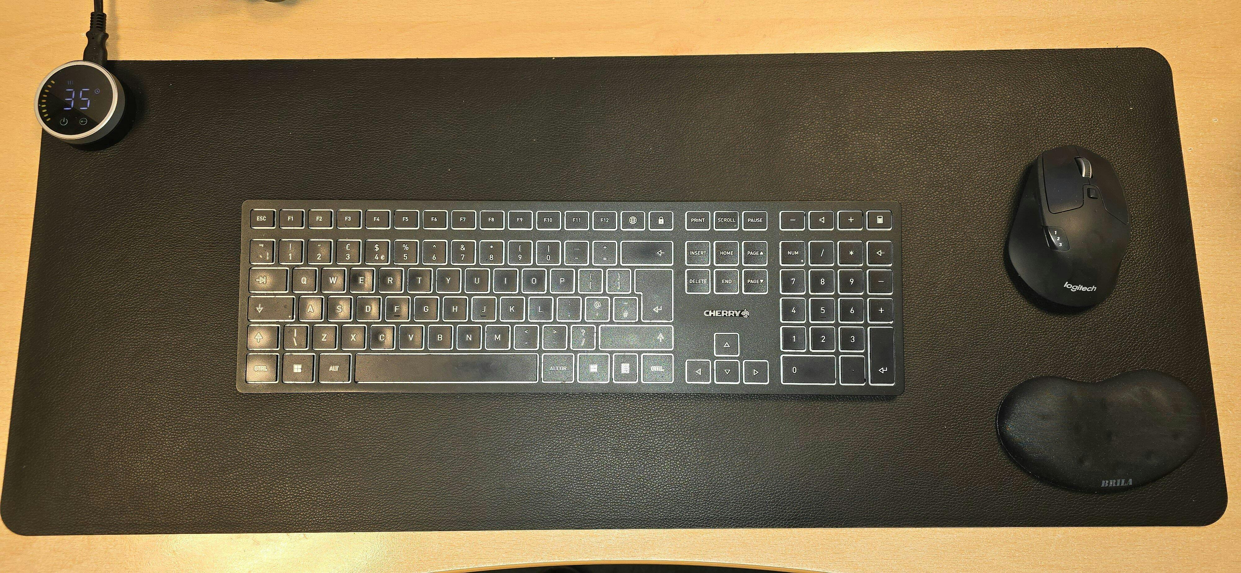 During the winter months, I suffer from cold hands that in turn causes pains in my knuckles. I have been thinking about getting a heating desk pad for a while now, but found very mixed reviews online. I read the reviews on the Heatka website and decided to take the plunge, & I couldn't be happier. I have the temperature set at 35 which seems to work well for me all day, the additional auto timeout is a great feature & means its never left on by mistake. My keyboard, mouse & wrist rest all sit on the mat with no issues, it does get a little hotter under the keyboard, but that certainly doesn't have an impact on the equipment in anyway.