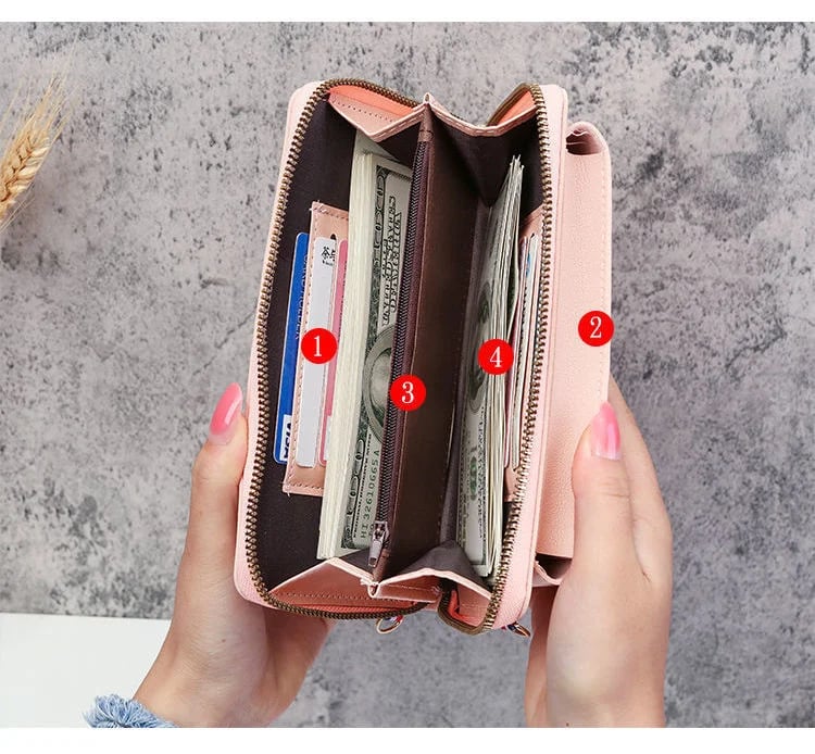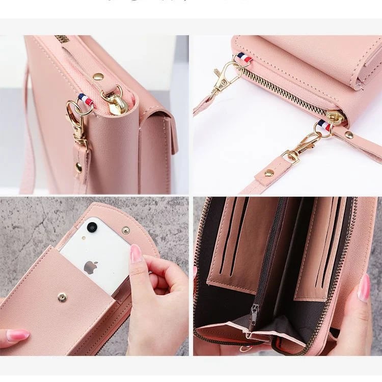 It has room for your cards, cash, glasses, keys, passport and much more. It also has an external pocket with a convenient push-button, to safely store your mobile phone.Â