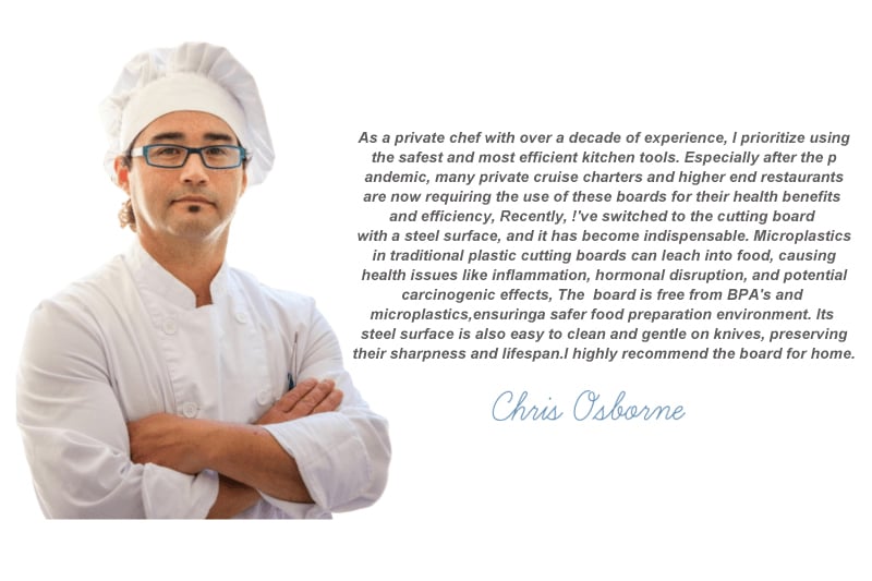 I meal prep every week. As someone who cooks regularly, I need my kitchen to be clean and my knives to stay sharp and this cutting board is perfect for that. The steel surface is really sanitary, and I don’t have to worry about harmful chemicals or particles. I used to use wooden boards, but they would get grooves that harbored bacteria, which was a nightmare. Unlike other boards, it doesn’t dull my knives, and it’s really easy to clean. It’s made my kitchen routine much smoother!