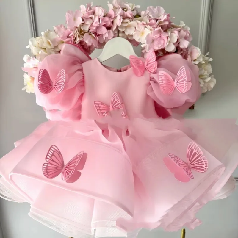 The highlight of this dress is its 3D butterfly appliqués that create a whimsical, fairy-tale effect, paired with a European and American-inspired princess silhouette. The soft pink hue adds charm and sweetness, making it ideal for young girls who want to feel like royalty. Crafted from high-quality, breathable fabrics, the dress ensures comfort while maintaining its structured and voluminous design, perfect for twirling and dancing.