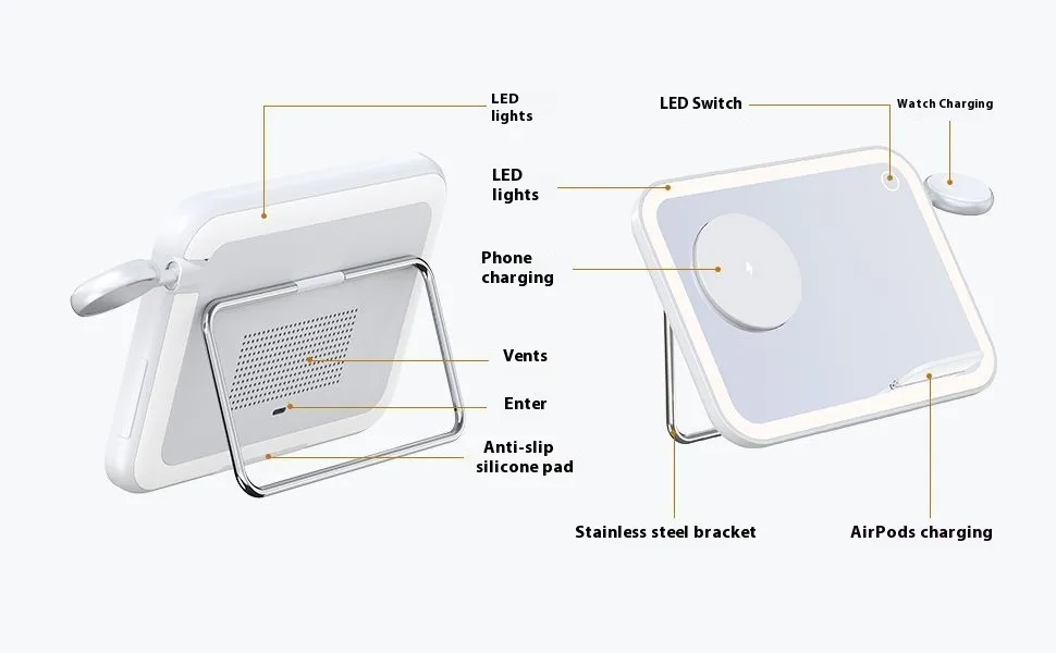 Product Description for Three-in-1 Wireless Charger LED Makeup Mirror RGB Small Night Light Four-in-One Desk Lamp Charging Stainless Steel Holder