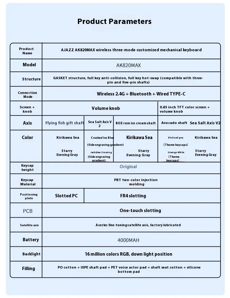 Package List: keyboard * 1 data cable * 1 manual * 1 dust cover * 1 key puller * 1 axis puller * 1