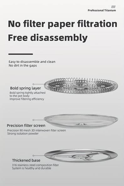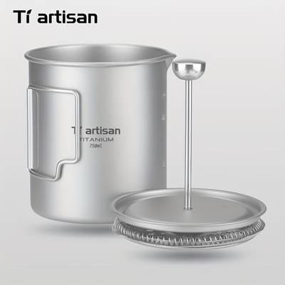 The Tiatisan 1pc pure titanium ultra-lightweight portable French press features a main body and lid crafted from pure titanium,