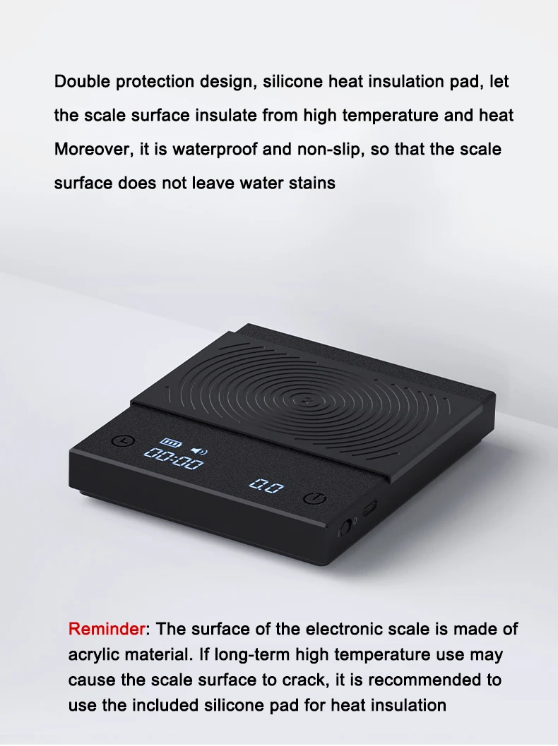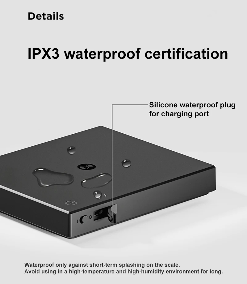 SUPERIOR MATERIALS: Constructed with high-quality acrylic, this digital kitchen scale is ultra compact and low-profile but fairly durable. Note: The surface of the scale panel is waterproof, but be careful to prevent liquid from entering the gaps in the body and the charging port. Included a silicone insulation waterproof pad.