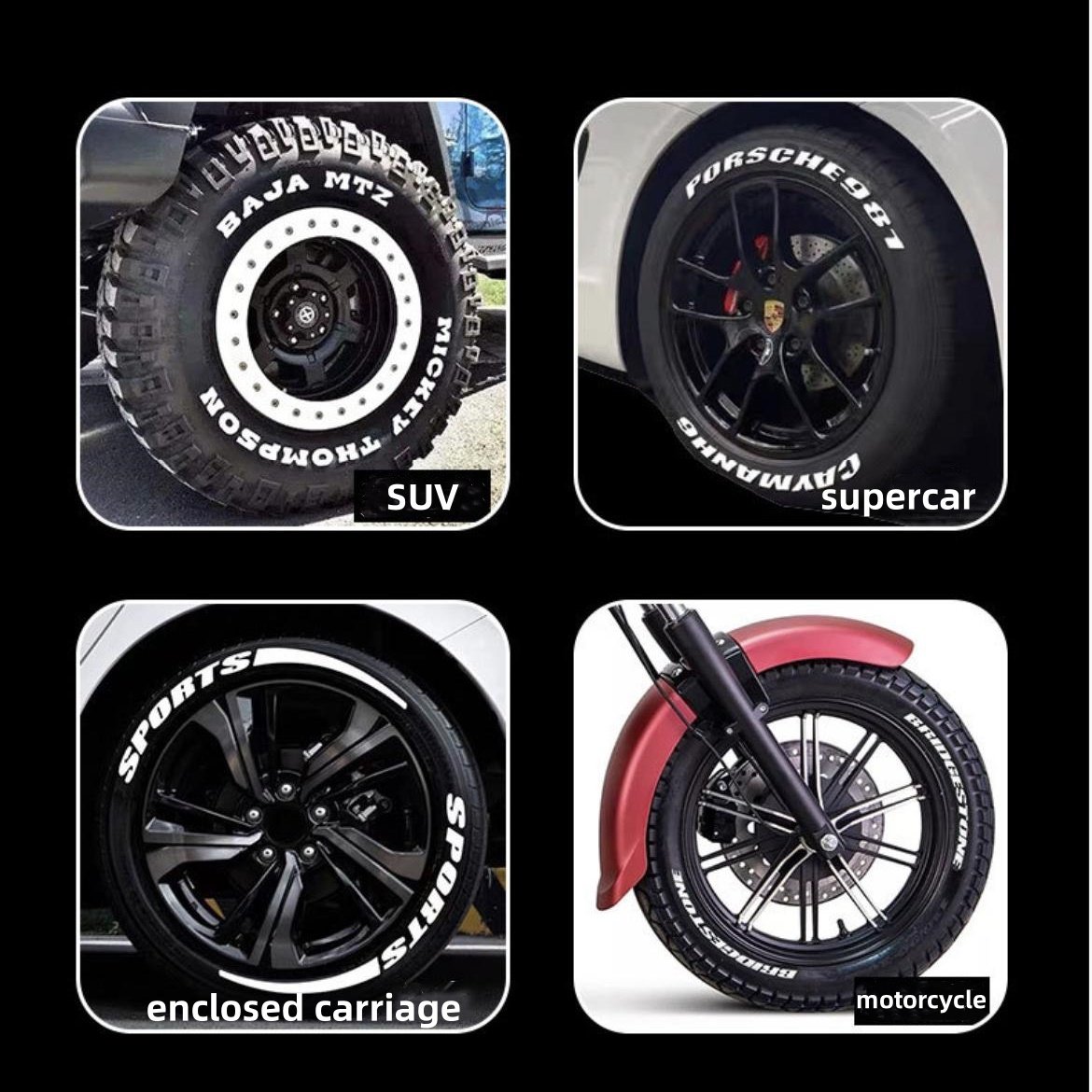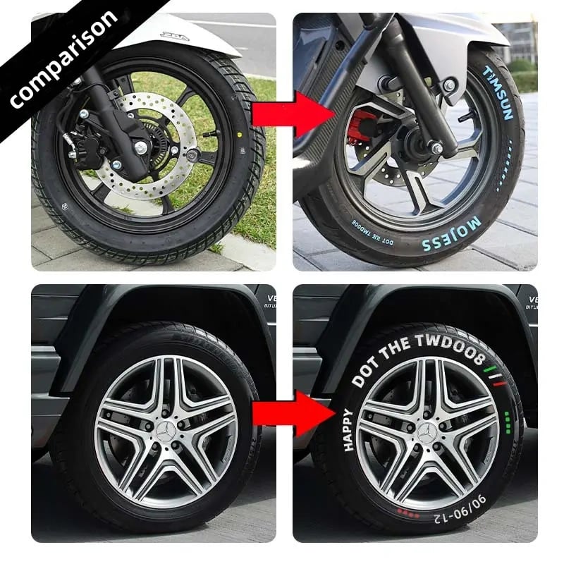 Versatility is another advantage. The Tire Graffiti Pen can be used to highlight factory tyre lettering, create custom text, or add unique stylistic elements. It works well across a range of tyre types, including standard road tyres and performance-oriented designs, making it suitable for everyday cars, show vehicles, and motorsport-inspired builds.