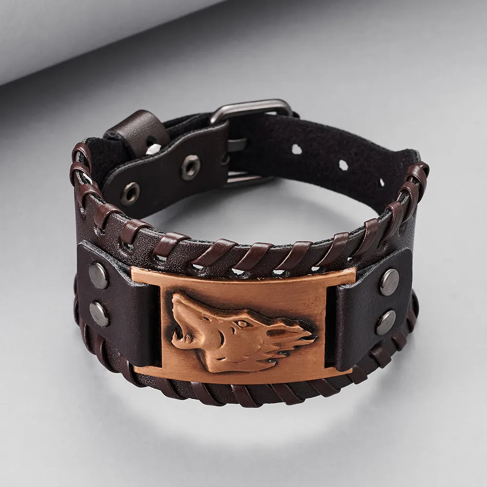 Toten Design Nordic Viking Odin Bracelet Genuine Leather Wolf Head Bracelet For Men Animal Bracelet