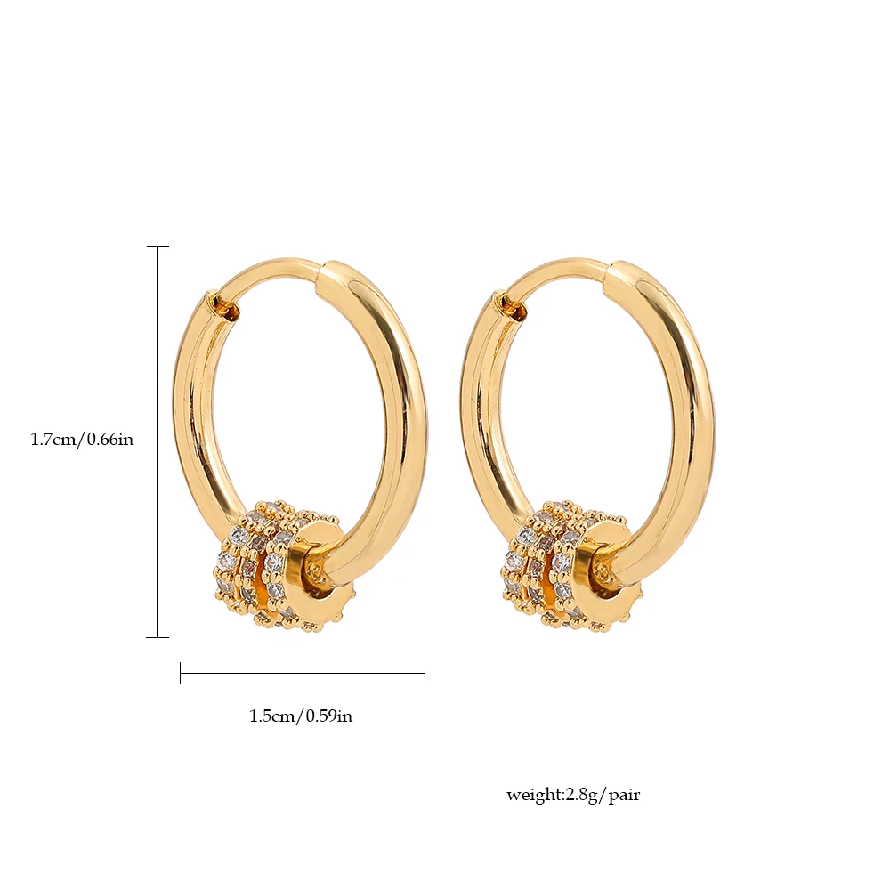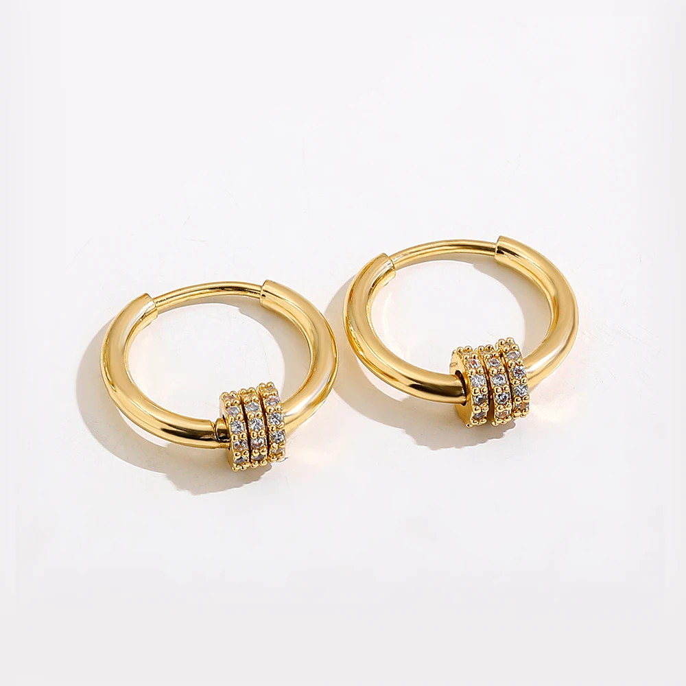 Add an edgy yet elegant touch to your jewelry collection with the Trendy Small Round Gold Color Stainless Steel Huggies Hoop Earrings. Featuring sparkling zirconia CZ stones and a unique triple gear charm design, these earrings are the perfect accessory for those who love fashion-forward, luxurious jewelry. Their small hoop style and lightweight construction make them ideal for both daily wear and special occasions.