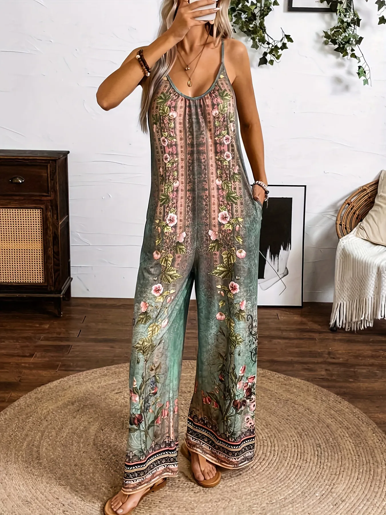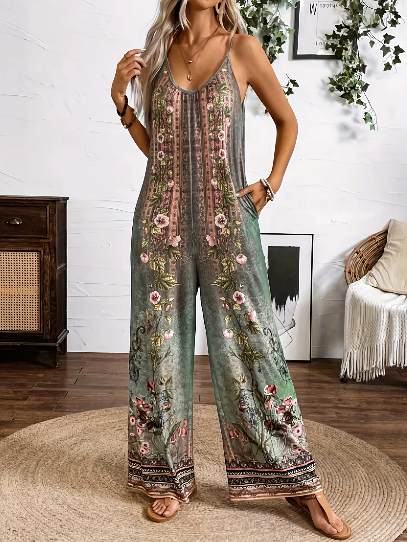 Whether you're attending a summer festival, a casual gathering, or just enjoying a day out, this piece effortlessly combines fashion with function. The long, patterned sleeves balance out the streamlined jumpsuit body, creating a visually striking look that’s both elegant and contemporary. The design includes a cinched waist to enhance your figure, while the lightweight material ensures all-day wearability.
