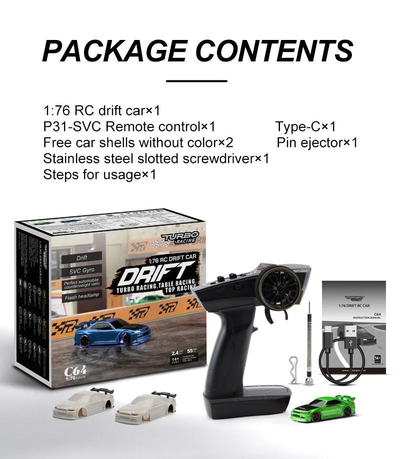 The Turbo Racing 1vs76 C64 Drift RC Car is an exciting, high-performance remote control car that delivers thrilling drifting action and precise control. Designed for both kids and adults, this RTR (Ready to Run) kit provides hours of fun and excitement with its full proportional remote control features and gyro stabilizer for enhanced driving performance. Whether you’re new to RC cars or a seasoned enthusiast, the C64 Drift RC Car offers an authentic racing experience that will keep you on the edge of your seat. In this guide, we’ll explore the features, benefits, and why this RC car is perfect for all ages.