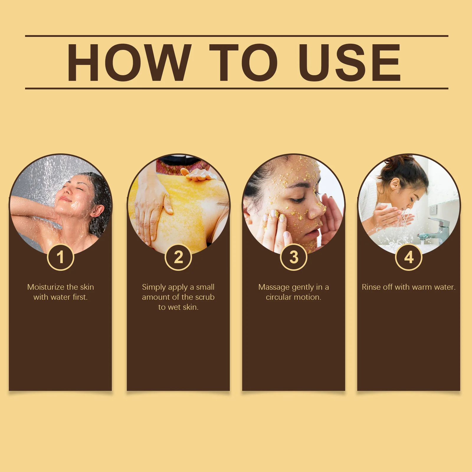 - Apply a generous amount of the scrub to damp skin.