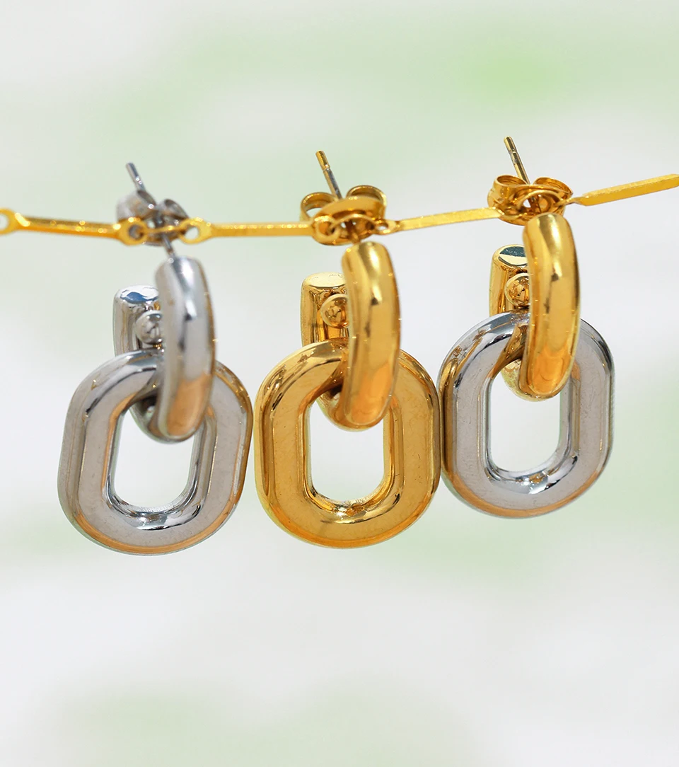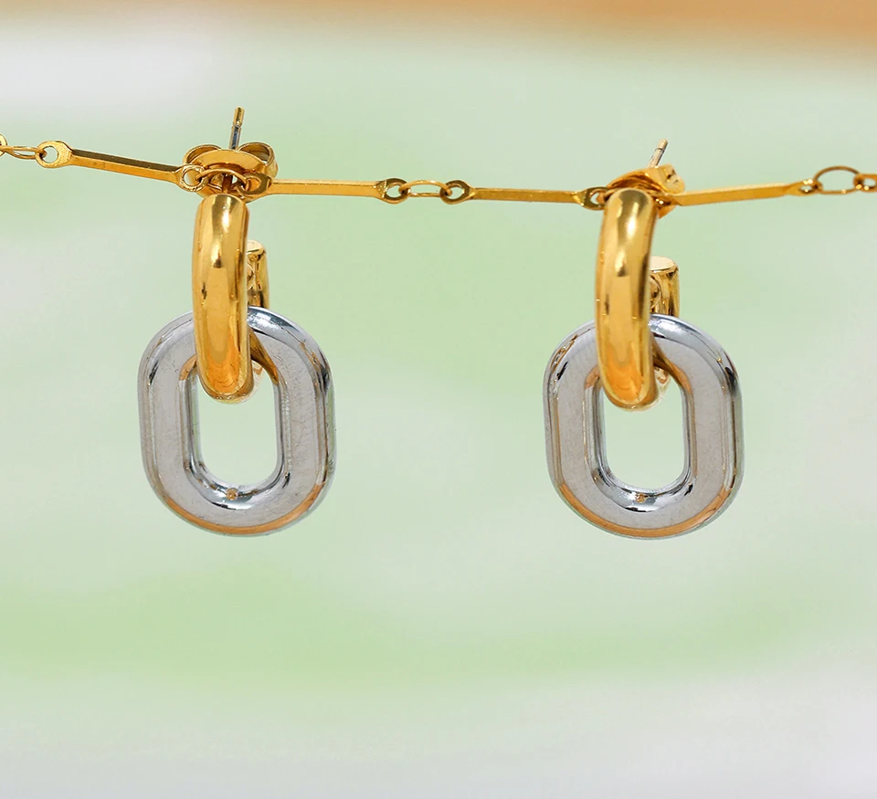 Make a stylish statement with these Two-Tone Oval Circular Ring Dangle Earrings. Designed for women who love combining elegance and modern style, these earrings feature a unique two-tone design with a blend of stainless steel and 18K gold plating. The oval circular rings and dangle design offer a sophisticated yet bold aesthetic that will complement both casual and formal outfits.
