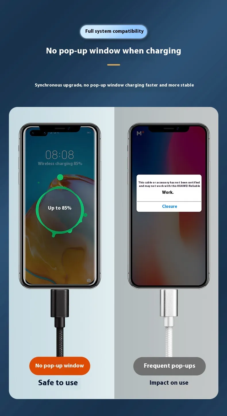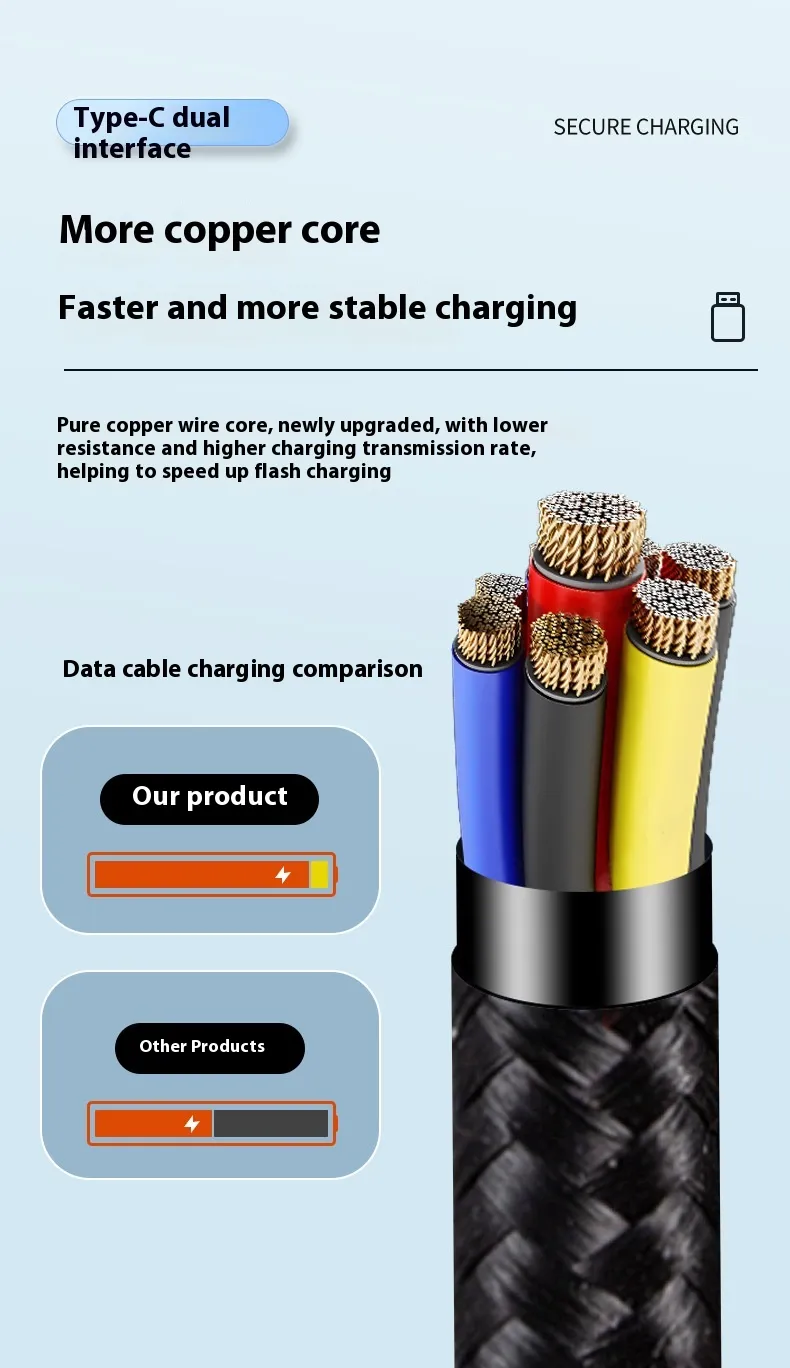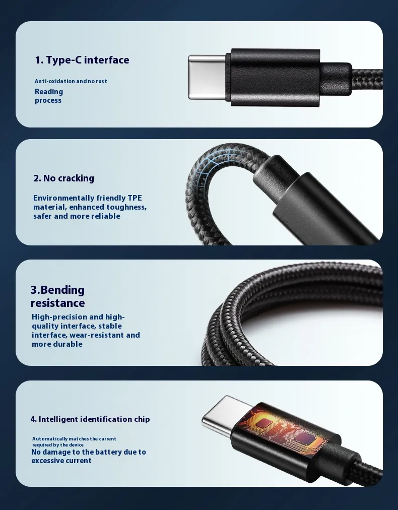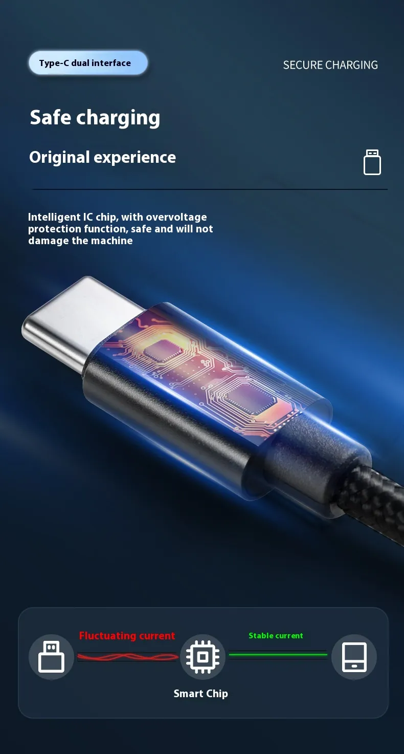 Made from premium materials, the Type-C cable is durable, tangle-resistant, and built to last. Its reinforced connectors prevent wear and tear, while the flexible design ensures easy handling and storage. Capable of delivering fast charging without overheating, it safeguards your devices while keeping them fully powered in less time.