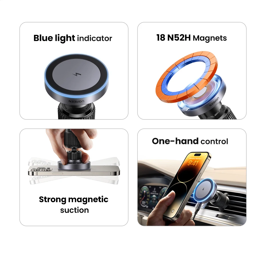- Can I use this charger with a case on my iPhone? Yes, the UGREEN Magnetic Car Phone Holder Wireless Charger Stand is designed to work with MagSafe-compatible cases. It may also work with other cases, but magnetic alignment and charging efficiency may vary.