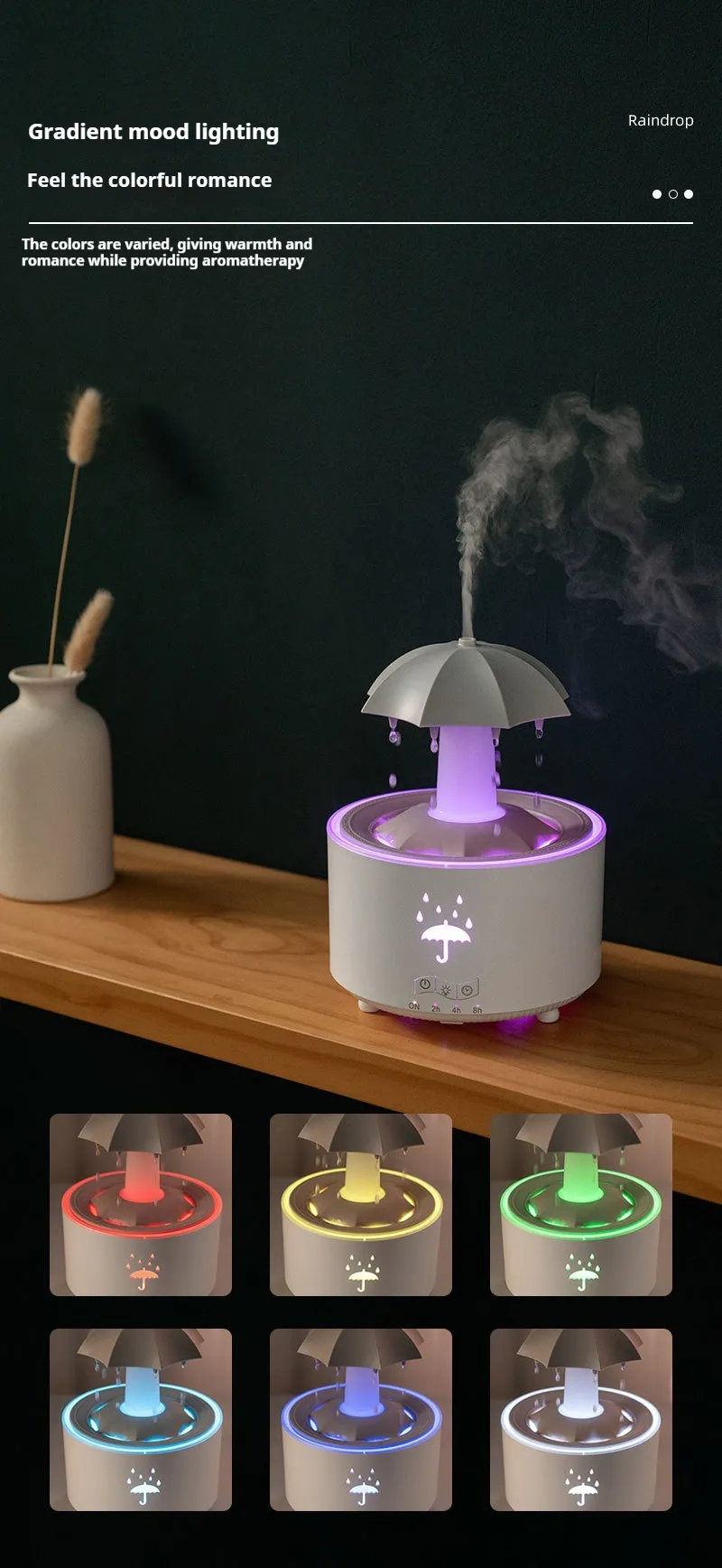 The umbrella-inspired structure guides the mist gently downward or outward, creating a soft, rain-like visual effect that enhances the atmosphere of the room. This design not only looks appealing but also helps distribute moisture evenly in the immediate area.