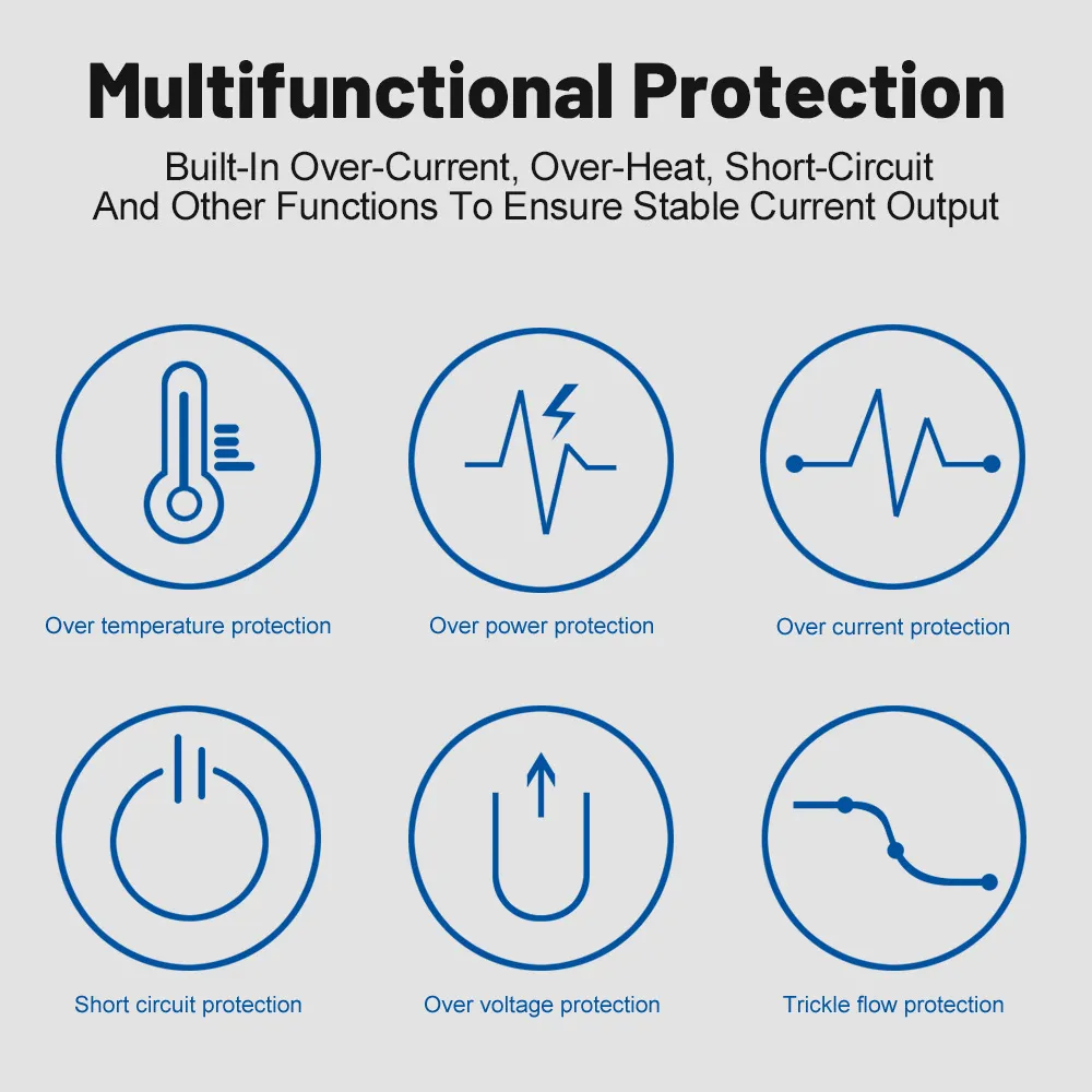- Safety Features: Over-voltage, over-current, and short-circuit protection to ensure safe charging.
