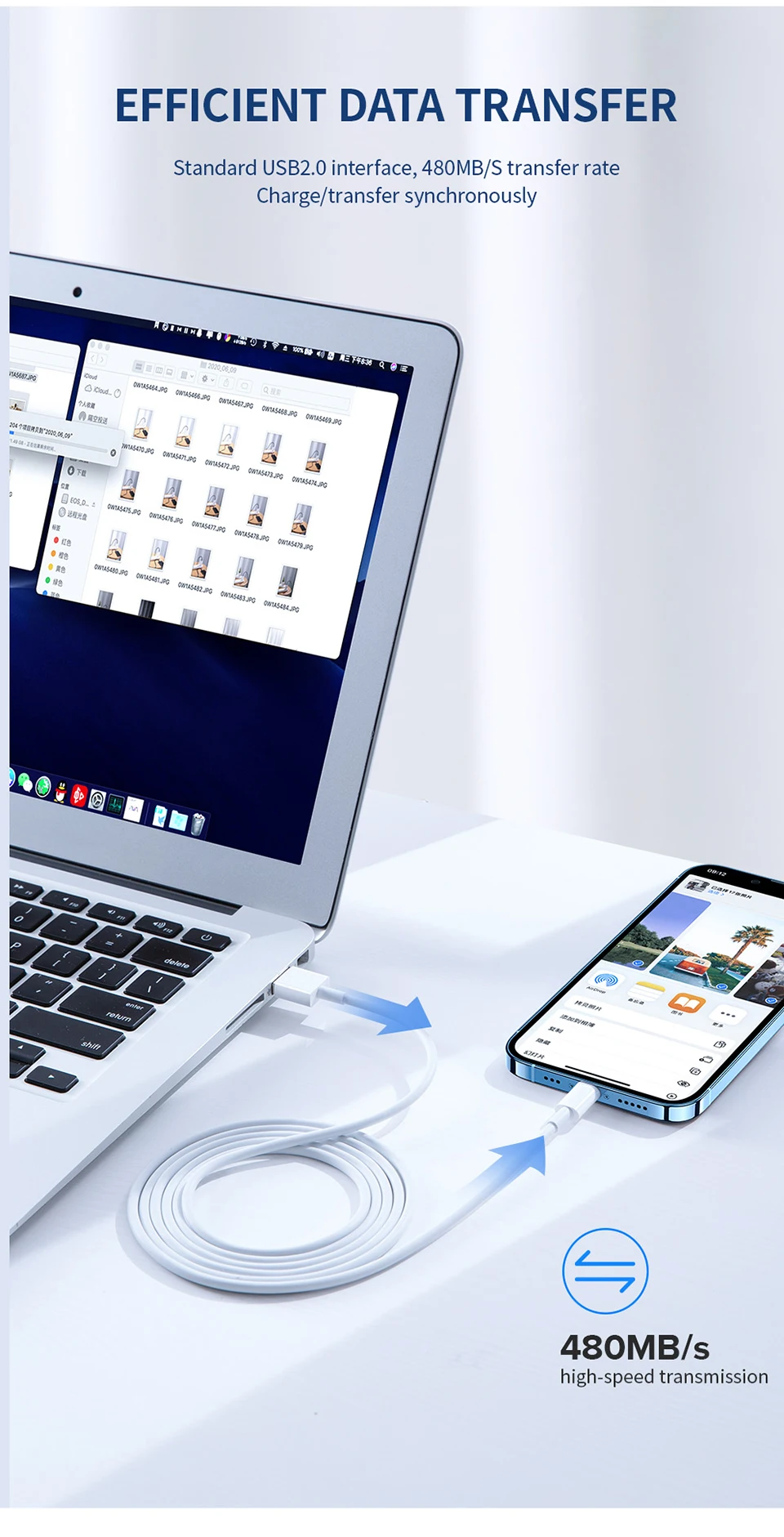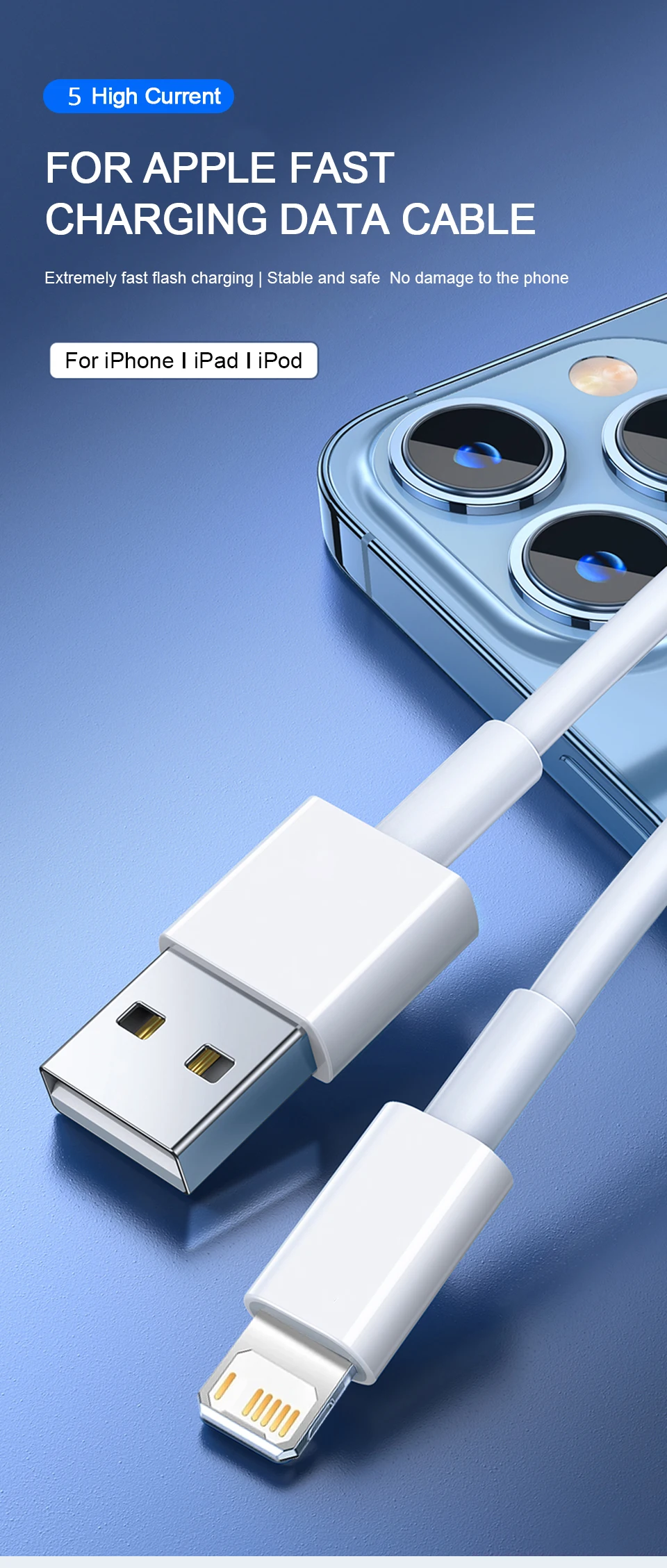 This USB cable is designed for iPhone 14, 13, 12, 11 Pro Max, Mini, 6, 7, 8 Plus, XS, X, XR, SE, and iPad. It supports 20W fast charging and data sync, available in lengths of 0.25M, 1M, and 2M, providing flexible charging solutions for your devices.