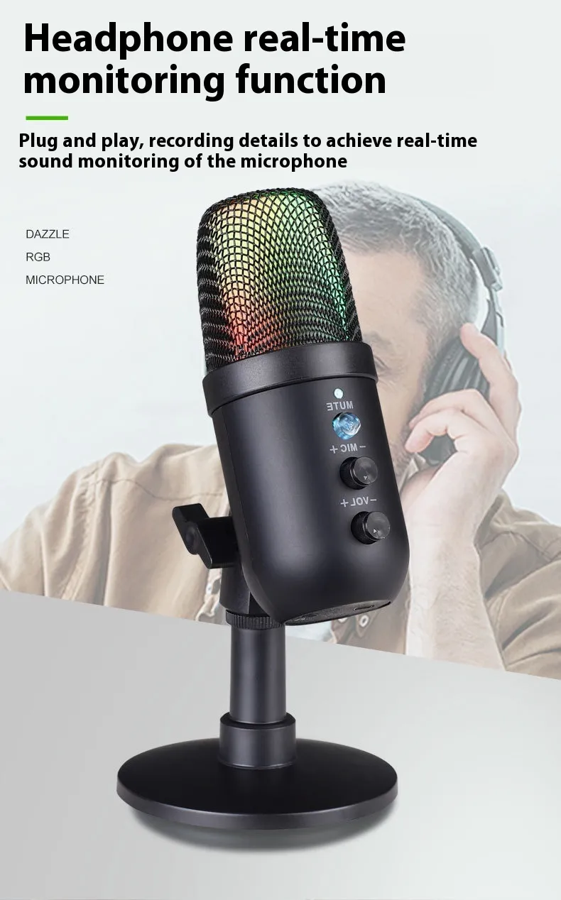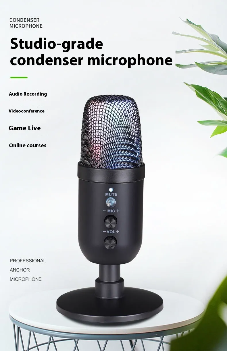 The USB Microphone RGB Mobile Phone Computer Live Karaoke E-sports Games Microphone is a professional-grade microphone designed for content creators, gamers, and music enthusiasts who want superior sound quality and stylish aesthetics. Whether you're live streaming, recording podcasts, hosting karaoke sessions, or engaging in intense e-sports gameplay, this microphone offers crystal-clear sound capture, reliable performance, and a visually stunning RGB light feature to enhance your setup. The plug-and-play USB connectivity makes it easy to set up, while its versatile design ensures compatibility with computers, mobile phones, and gaming consoles.