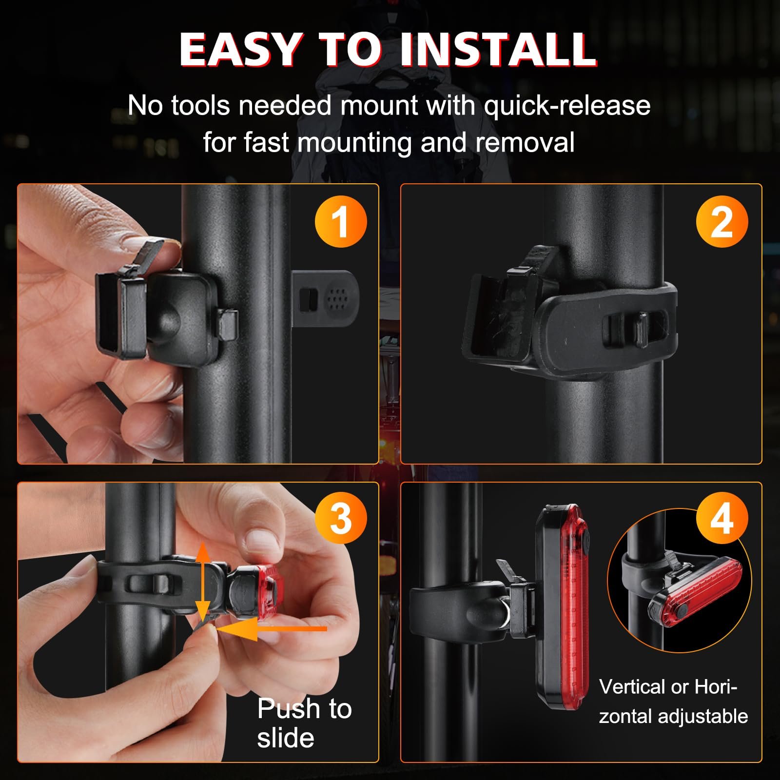 The Tail Light feature an one-touch switch with four different lighting modes depending on your preference. Include full brightness, half brightness, fast flashing and slow flashing.