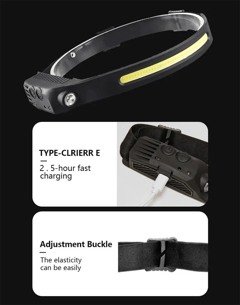 1. Full view ultra-light induction headlamp: far and near dual light comfortable Wearingtypebe-c fast charging.