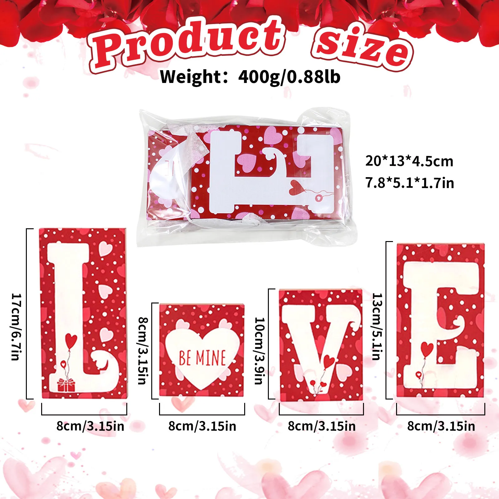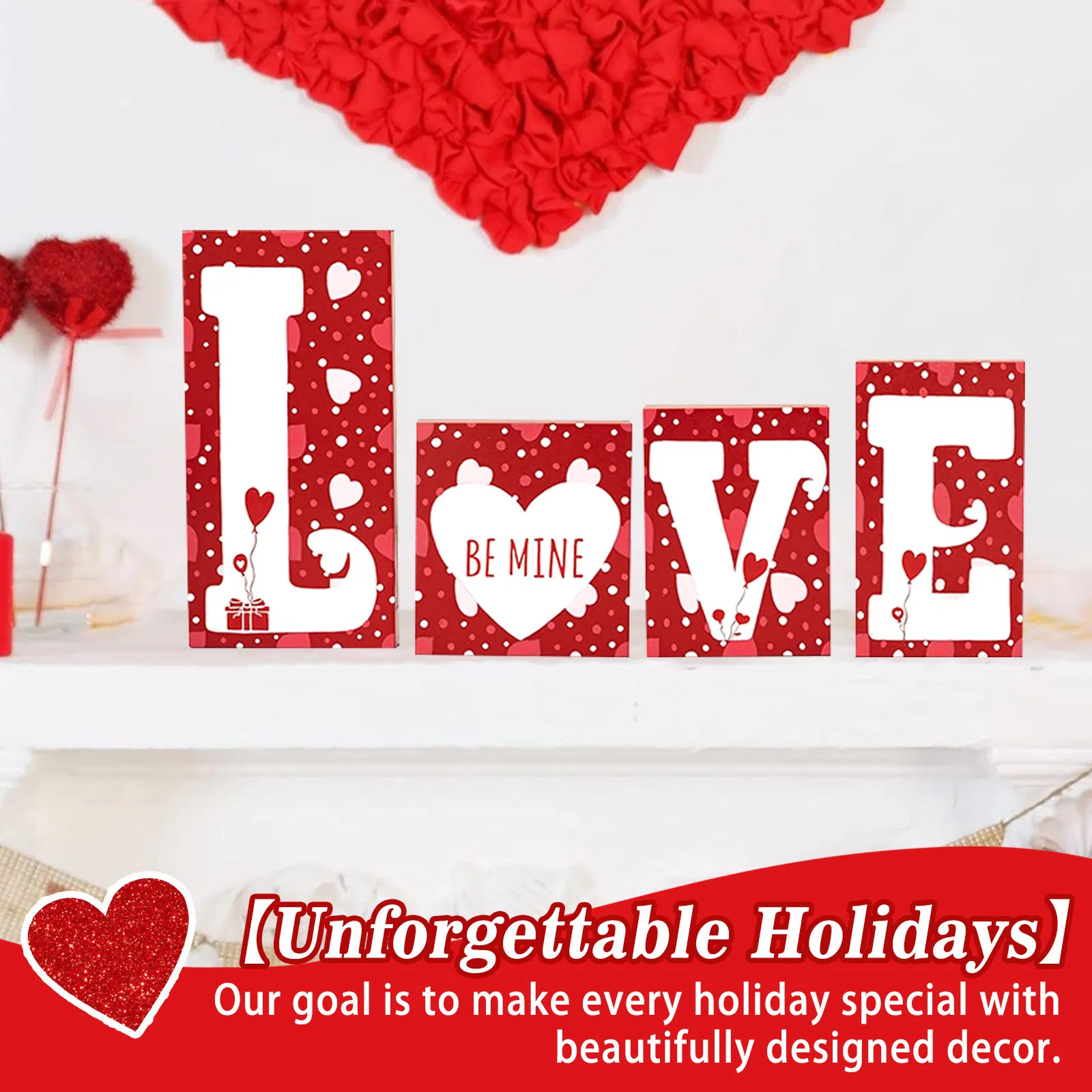 The Valentine's Day Wooden Craftwork Decoration LOVE Decorations are handcrafted wooden ornaments designed specifically for celebrating Valentine's Day. These decorations come in various forms, including heart shapes, love quotes, intricate designs, and personalized engravings. Made from high-quality wood, each piece showcases meticulous craftsmanship and attention to detail, ensuring that every decoration is unique and carries a touch of elegance. Whether displayed on a mantelpiece, hung as wall art, or used as table centerpieces, these wooden decorations add a warm and rustic charm to your Valentine’s Day décor.