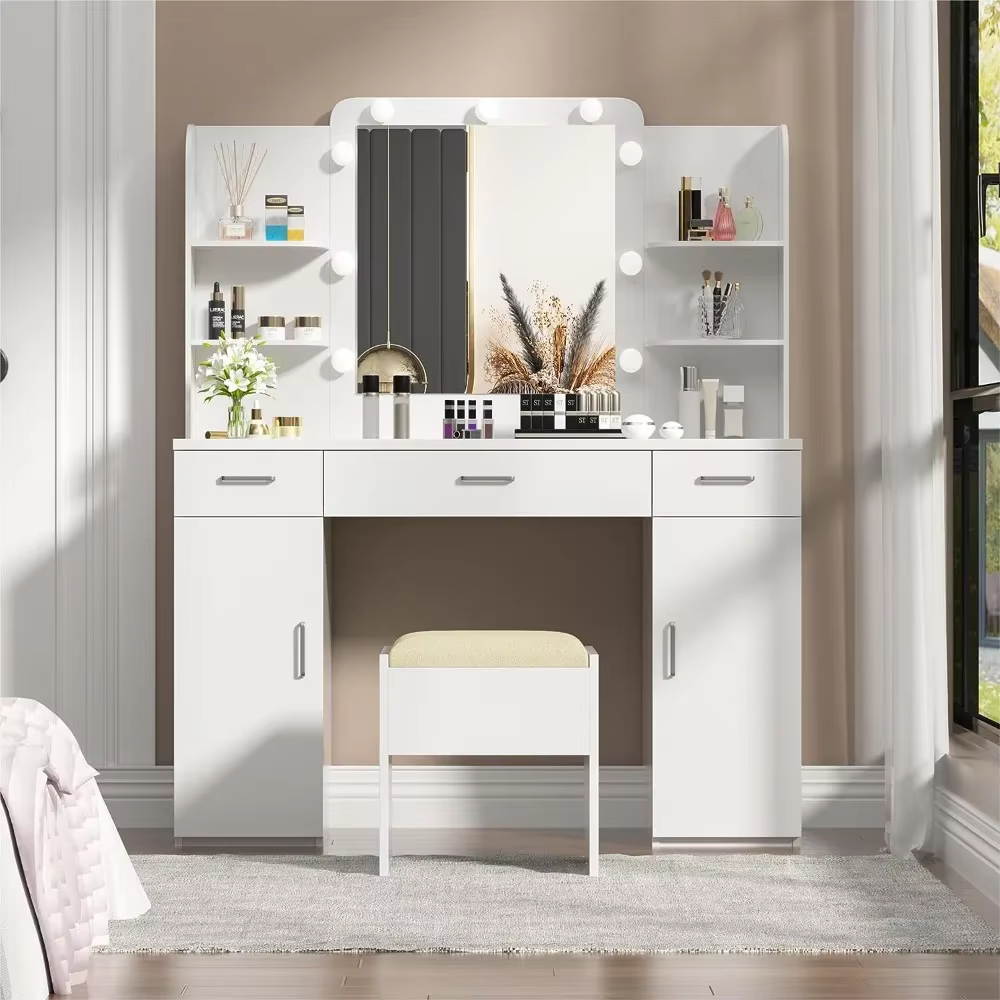 Enhance your daily routine with this large, stylish vanity desk, offering plenty of storage and the perfect lighting for all your beauty needs.