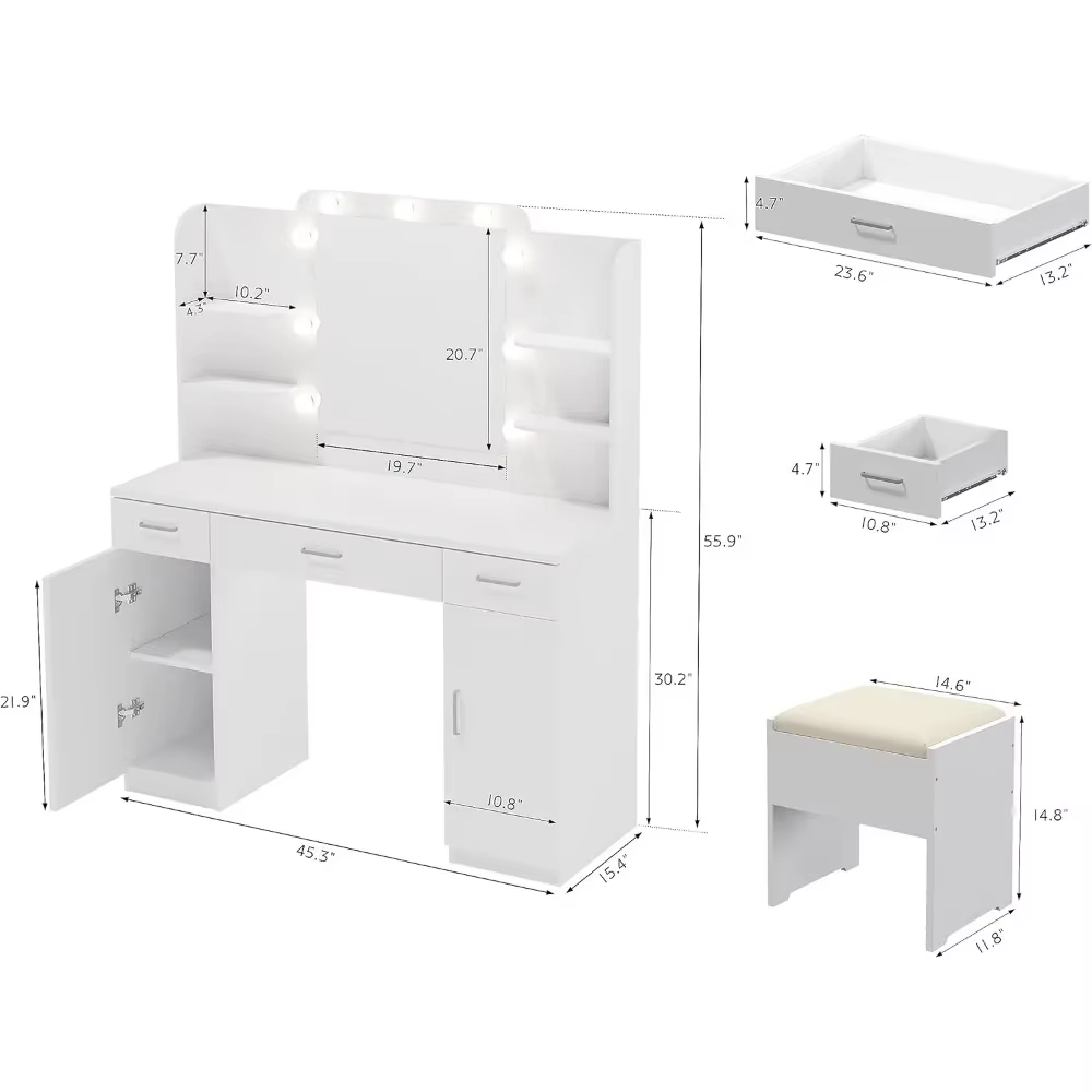 Upgrade your beauty routine with this elegant 45.3" Vanity Desk Set, complete with a mirror and lights, designed to provide the perfect setting for makeup application and skincare. Featuring a large tabletop, this makeup vanity offers ample space for all your cosmetics and beauty essentials. The built-in lights around the mirror ensure optimal lighting, allowing for precise makeup application, while the included comfortable stool adds a touch of luxury to your vanity experience.