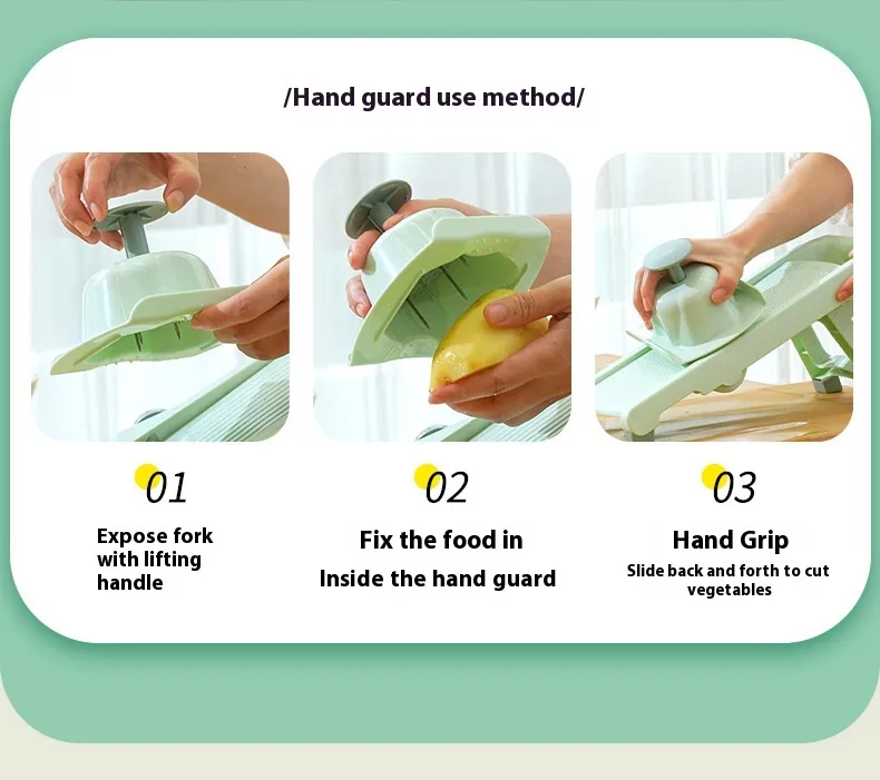 Safe to Use: Equipped with safety handle, the pusher protect your hands. non-slip handle free fit perfectlh on a smooth surface, and non-slip mat on the bottom of the slicer body, avoid any damage during operation and make cooking safety.