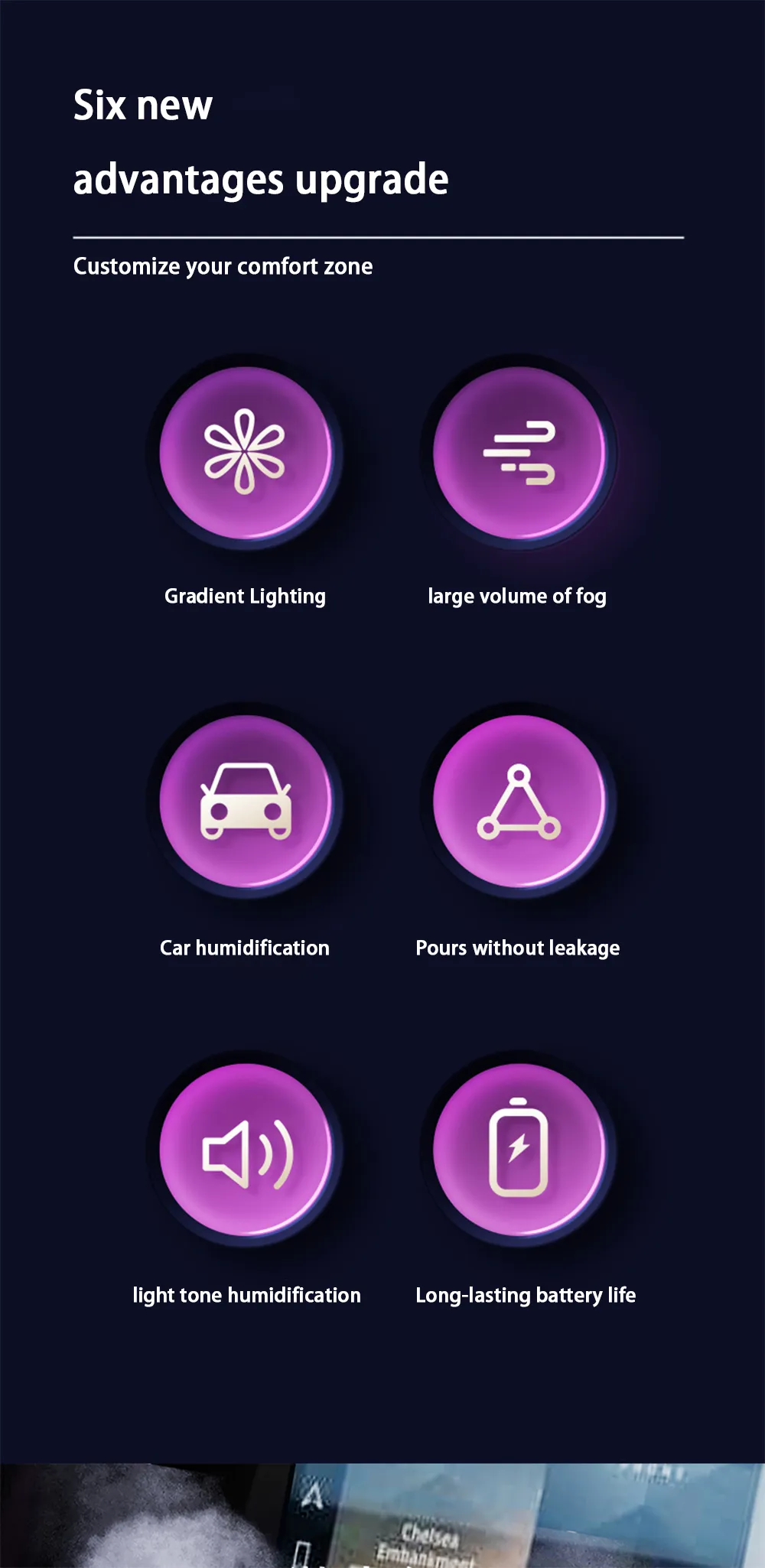 Wireless Design: The vehicle-mounted humidifier is completely wireless, offering ease of use without the need for cables or