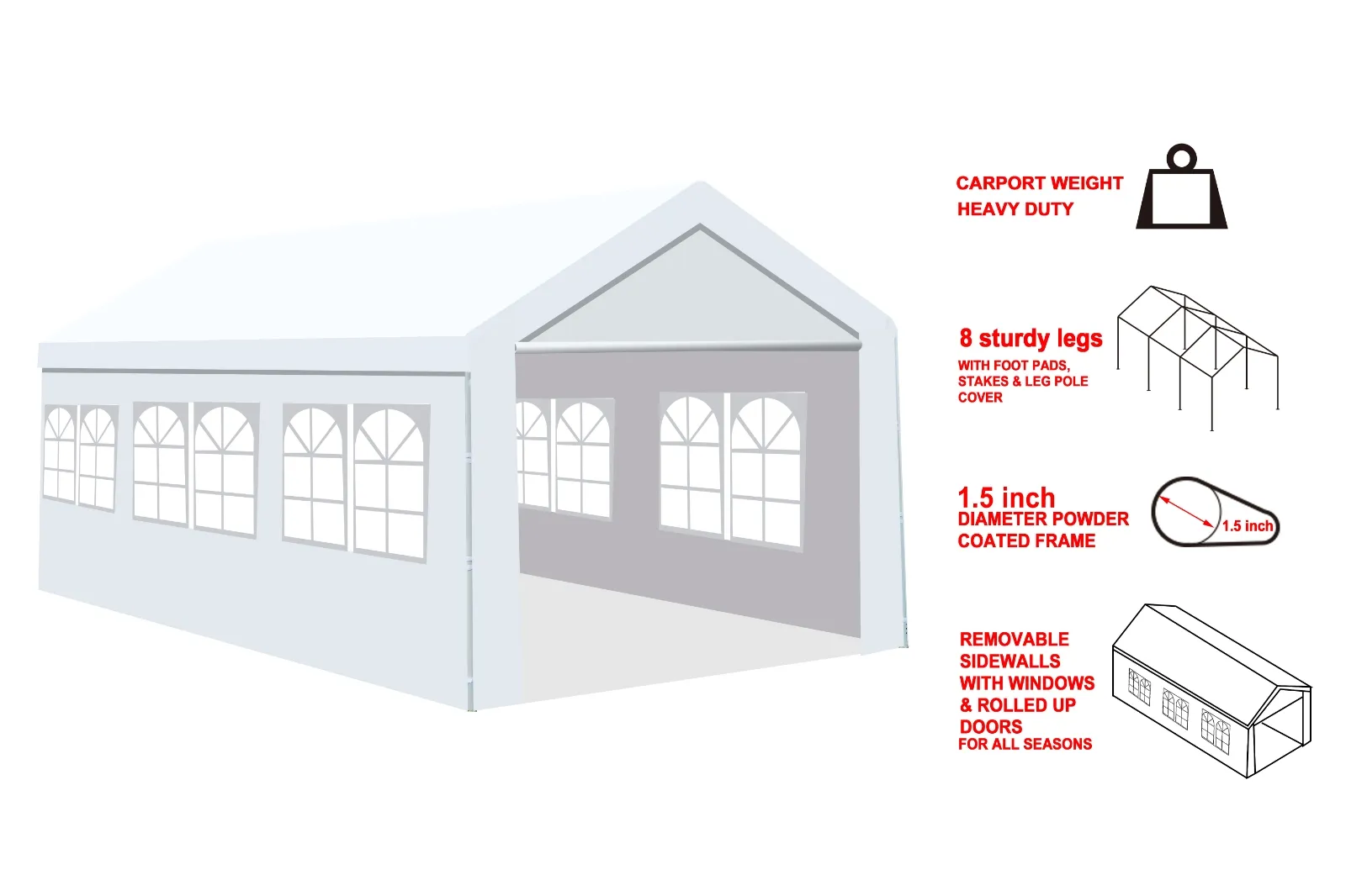 2 removable sidewalls & 2 removable doors for cross ventilation and venting.