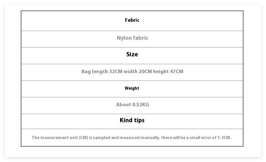 DescriptionMaterialClothProduct AttributesOrdinaryPackage Size470*320*50(1mm)