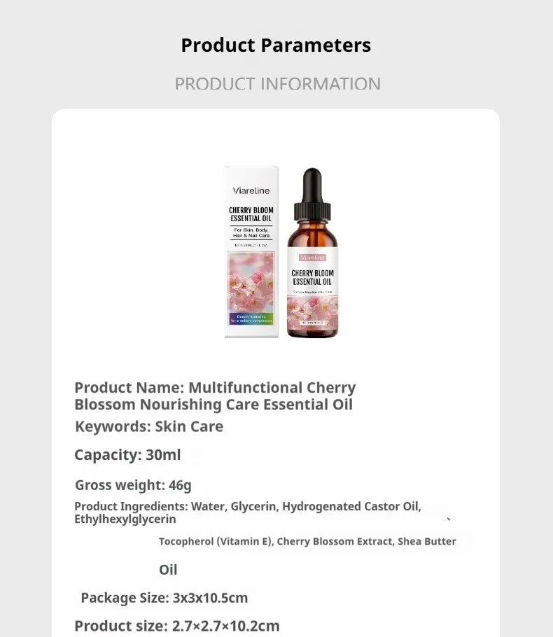 cherry blossom essential oil, hydrating essential oil, multi-use beauty oil, nourishing skin oil, hair and nail care oil, radiant skin oil, cherry bloom oil, skin hydration serum, moisturizing hair oil, beauty oil for dry skin.