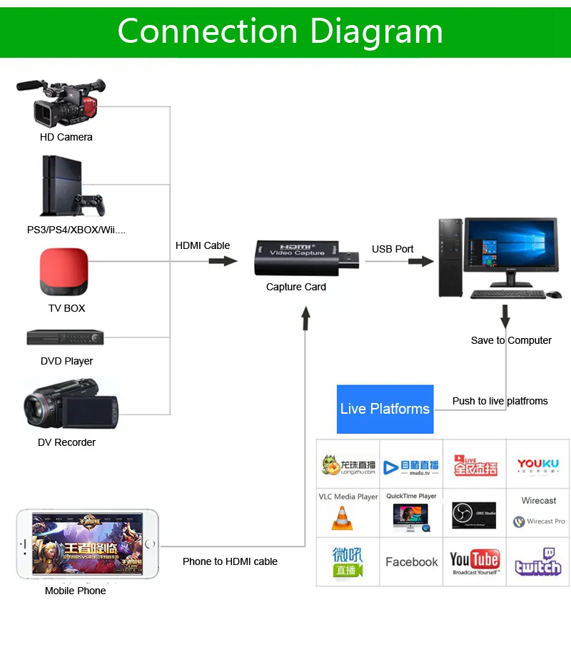 * Support most acquisition software, such as VLC, OBS, Amcap, etc.;