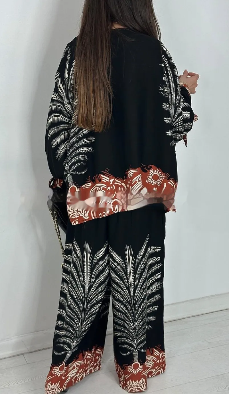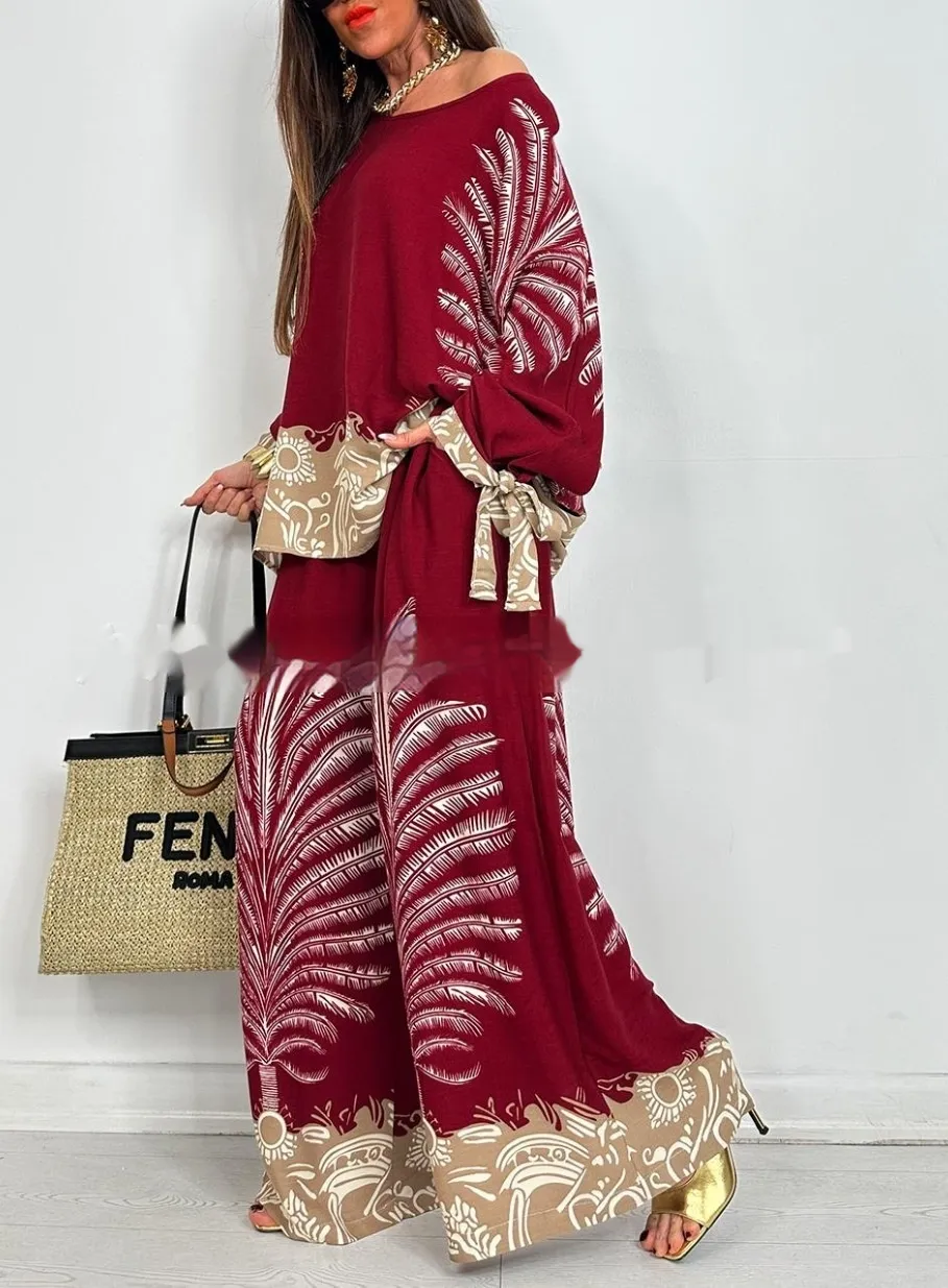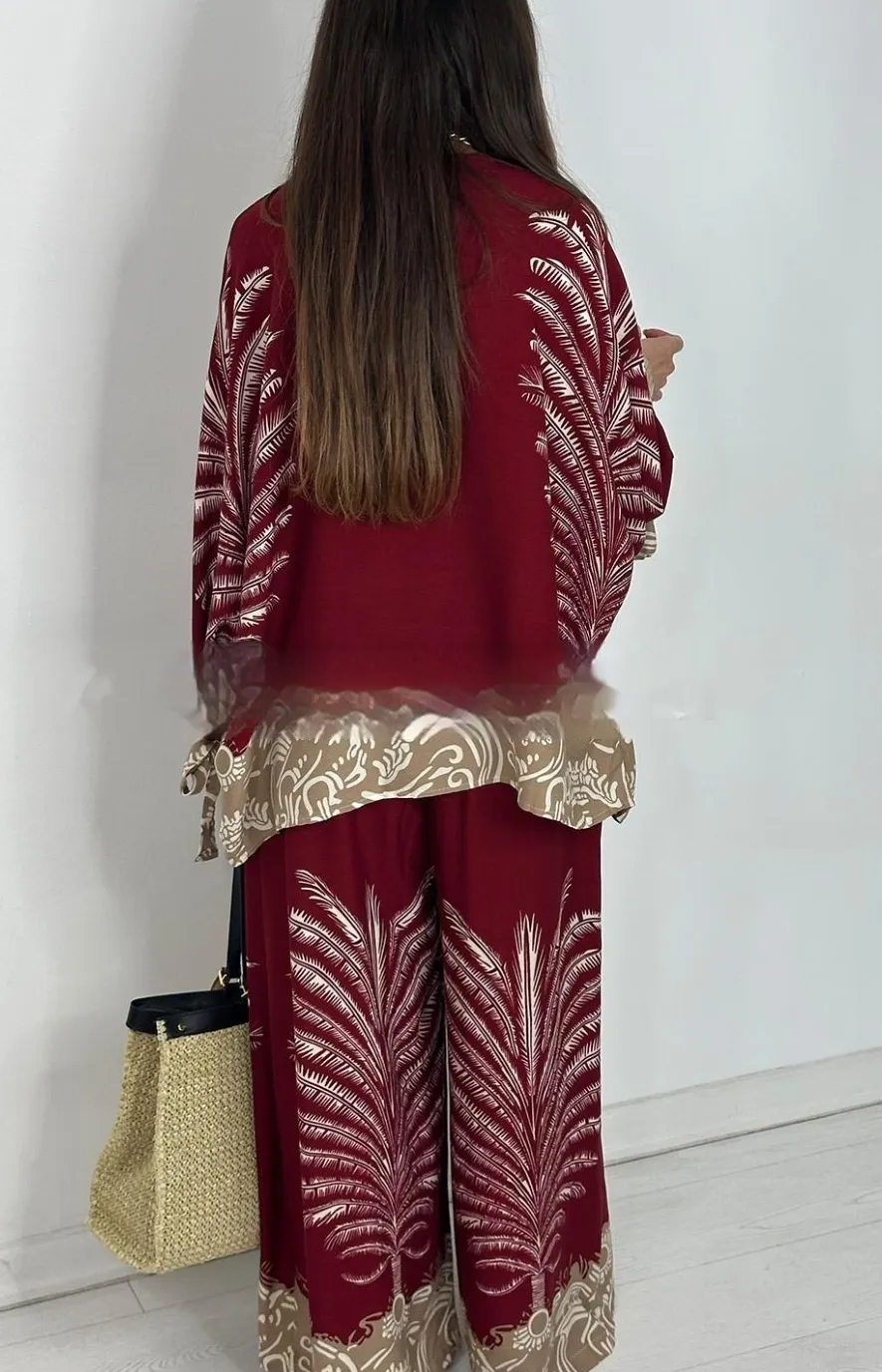 The coordinated floral design brings a touch of retro bohemian charm, while the wide-leg cut adds movement and grace to every step. Whether you dress it up with heels and accessories or keep it laid-back with flats and a tote, this outfit transitions seamlessly from day to night.