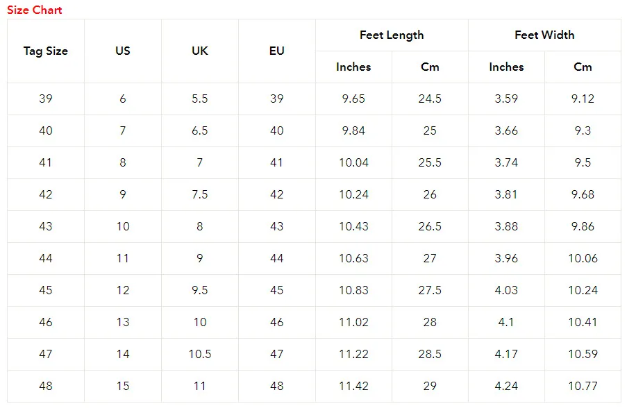 Size: 38, 39, 40, 41, 42, 43, 44, 45, 46, 47, 48