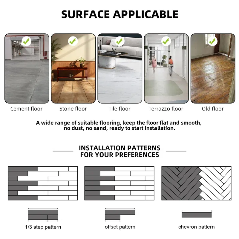 Wood Grain Texture: Easily achieve the look and feel of natural hardwood flooring with Jeedeson DIY self-adhesive flooring. High-resolution film print technology creates the realistic appearance of solid wood.