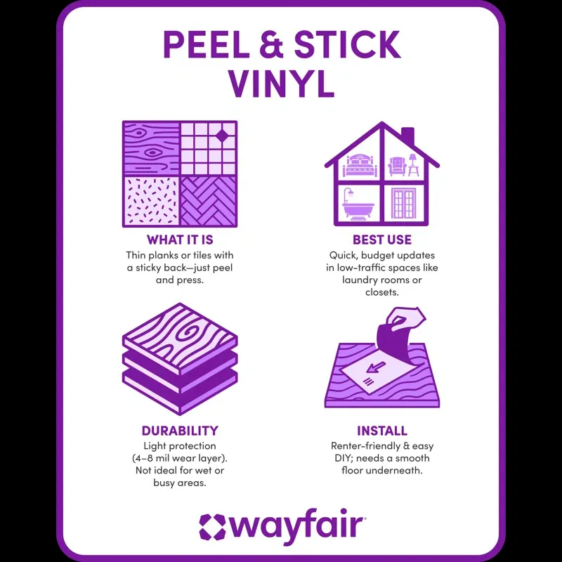 Available as luxury vinyl planks (LVP), vinyl tiles (LVT), or sheet vinyl, this flooring is suitable for a variety of spaces and installation methods. Vinyl flooring is moisture‑resistant and easy to clean, making it a practical option for rooms prone to spills or humidity. Its installation can be traditional glue‑down, loose‑lay, or click‑lock floating floor, offering flexibility depending on your project and subfloor conditions.