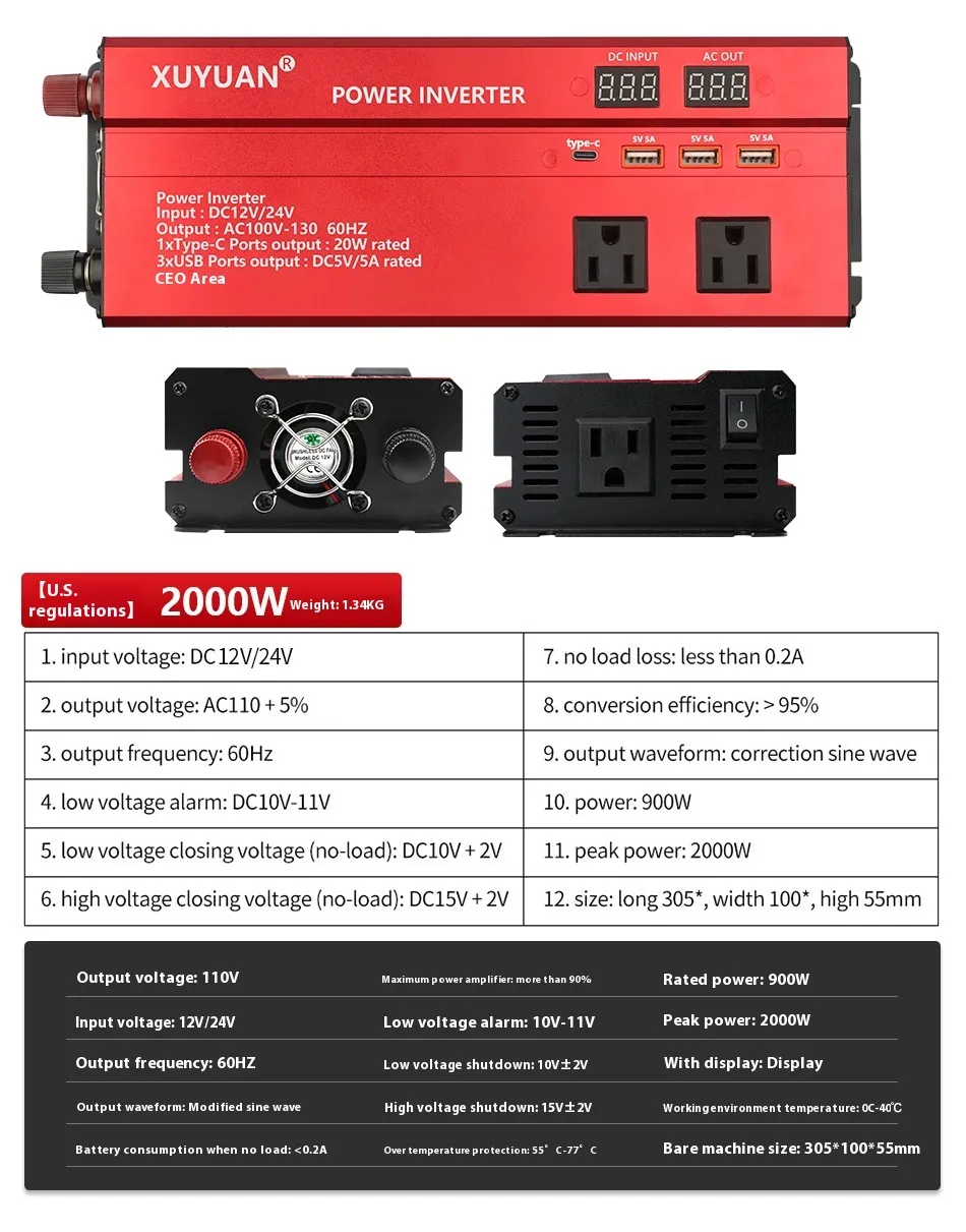 Specification: 12V/24V to 110V/2000W American standard black