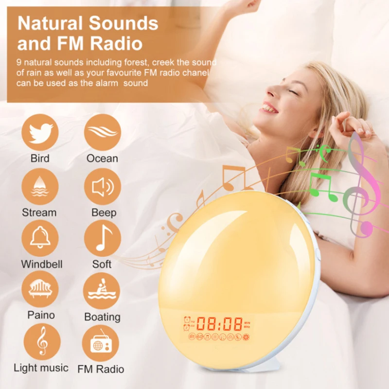 【Wake Up Light with Sunrise simulation】This Sleep Aid digital alarm clock is designed for everyone. in fact, especially for heavy sleepers and kids. Sunrise simulation light with 7 natural sounds&FM radio will be on gradually from 10% brightness to 100% by 30 minutes before alarm setting time,you can set the process to 20 minutes or 10 minutes. This wake up light gradually increases from soft morning Red to Orange until your room is filled with bright white light. By the time light has filled the room your preset natural sound wakes you up naturally, getting you ready for the day ahead.