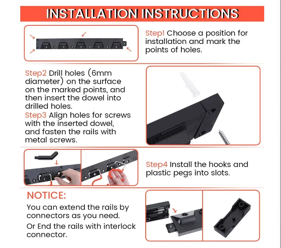 Crafted from high-quality metal, this garage tool organizer rack guarantees strength and durability. It is designed to withstand heavy tools and equipment without bending or breaking, ideal for holding everything from wrenches and hammers to gardening tools and cords.