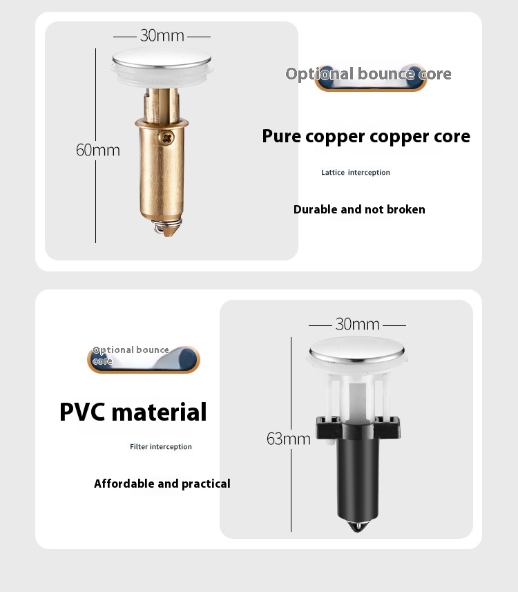 Unleash endless functionality with our Wash Basin Leaking Plug Bounce Core Drainer, perfect for maintaining a clean and efficient washbasin. This innovative drainer features a bounce core design that ensures quick and easy drainage, preventing water overflow and leaks. The built-in strainer effectively traps debris, hair, and other particles, keeping your drain clear and clog-free.