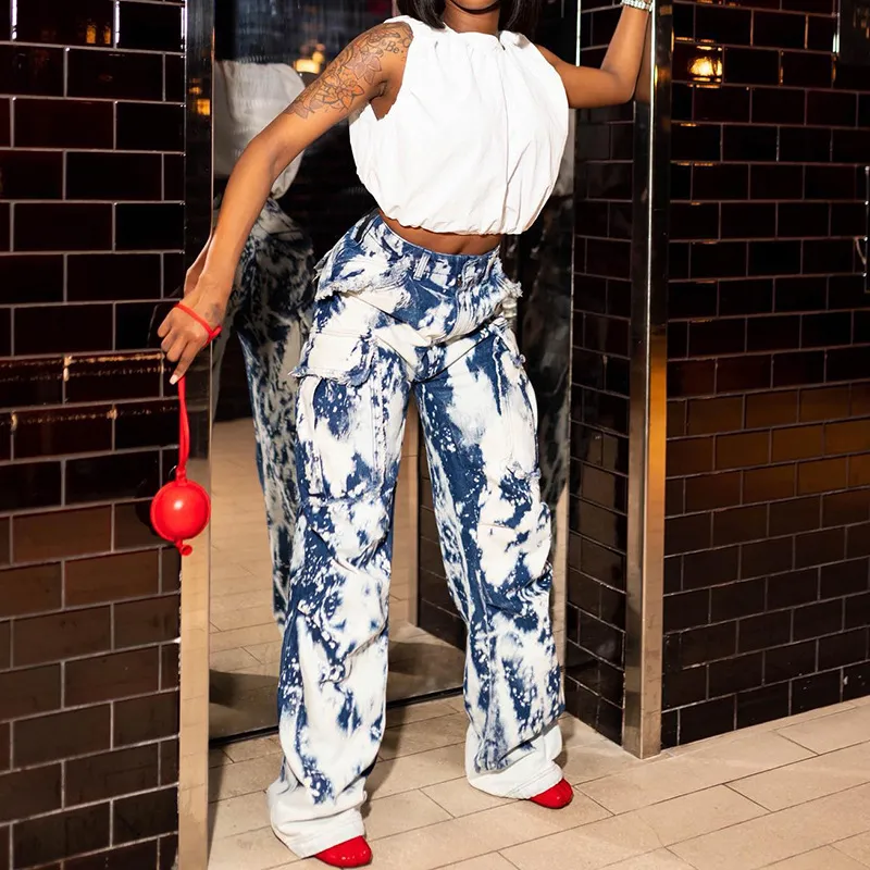 Washed Tie-dye Pocket Stitching High Waist Straight Jeans