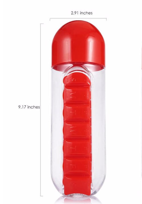 - Whether you are on vacation, work or outdoors, no matter what happens, no matter where you are, this water bottle with pill organizer can save you medicines and vitamins;