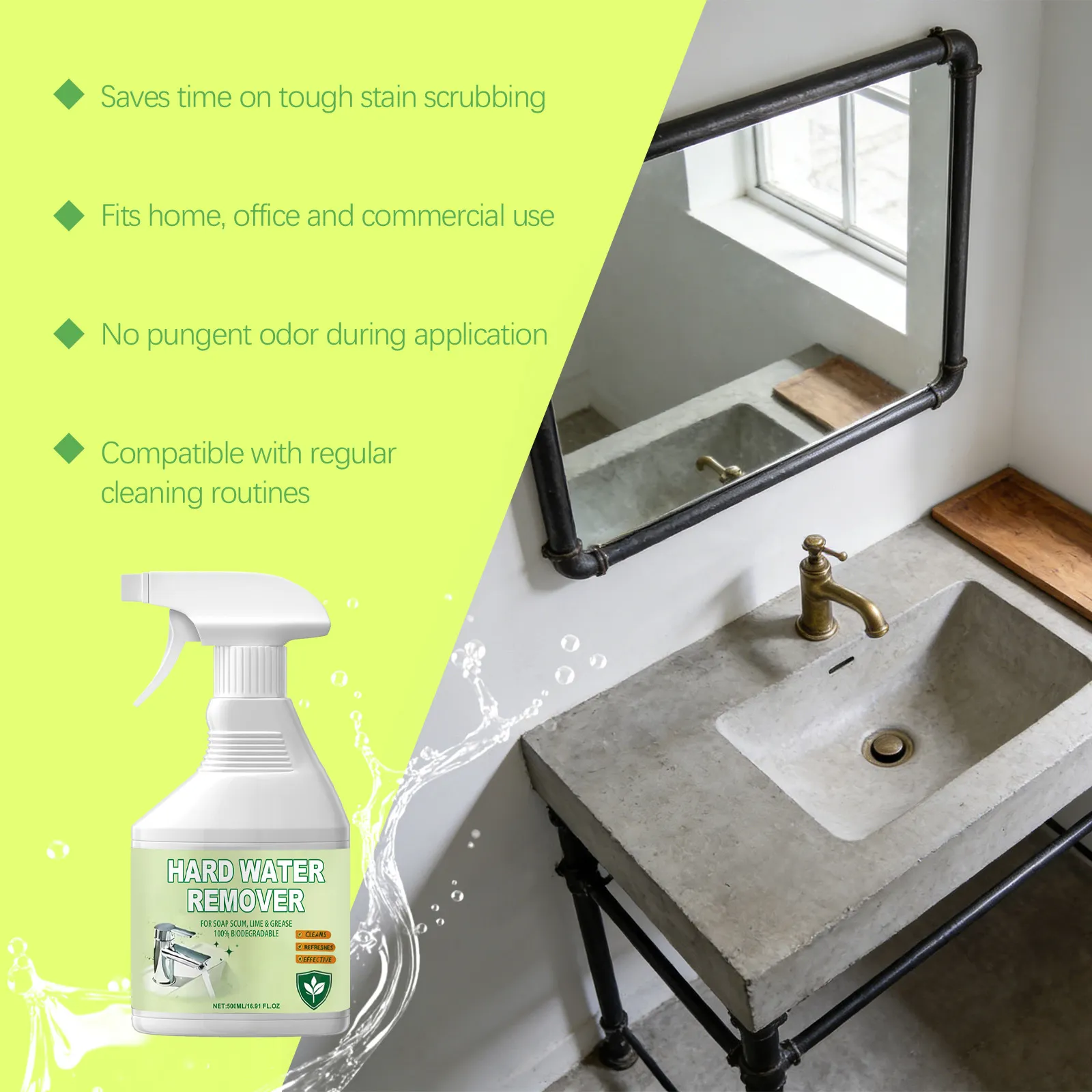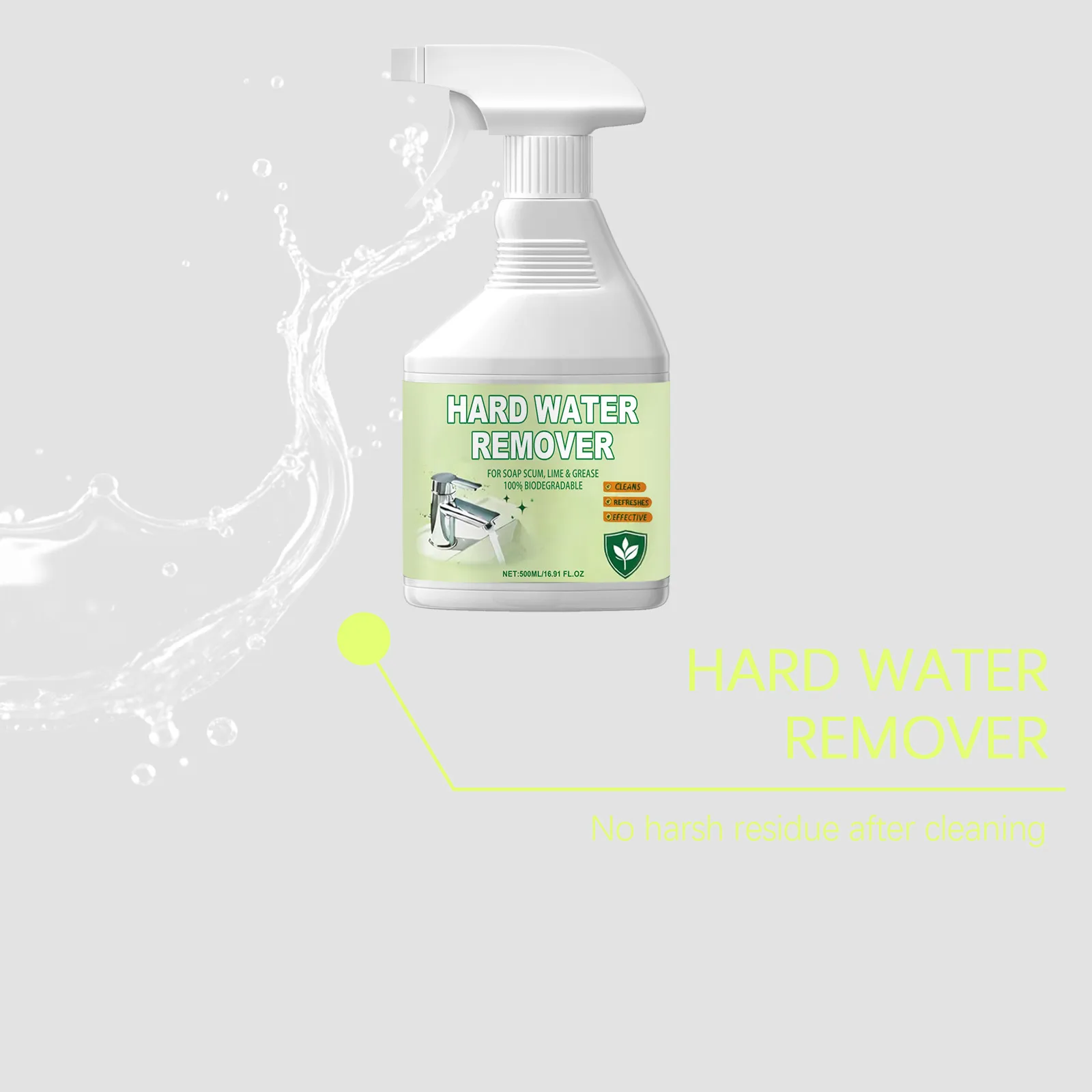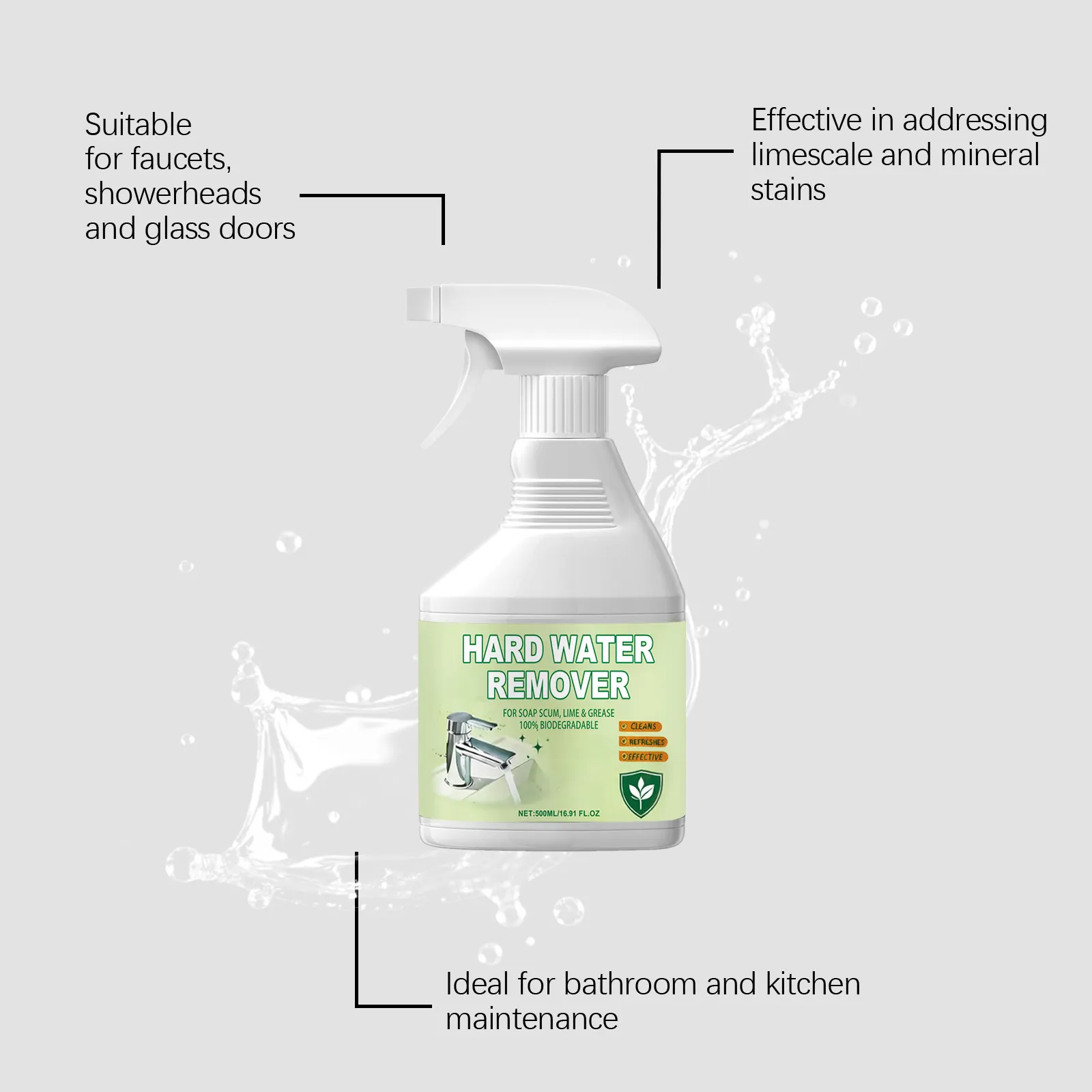 The remover is designed to be simple and convenient to use. Users spray or apply it directly onto the affected area, allow a short dwell time to let the agents penetrate and break down mineral bonds, then wipe or scrub gently with a microfiber cloth, soft sponge, or non-abrasive pad. Persistent spots may require additional passes or slightly longer dwell time, but the chemical action reduces the need for excessive mechanical force, preserving the finish of treated surfaces.