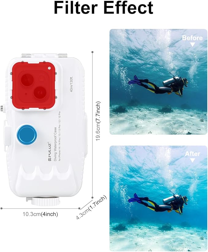 - ćDeepest dive depthćThe dive case is made of n durable and corrosion resistant material, waterproof and sealed with one-way valve pumping technology to make the case more airtight and prevent water from seeping into the waterproof case. You can use your iPhone underwater at up to 40M/131FT with confidence and take clear images.