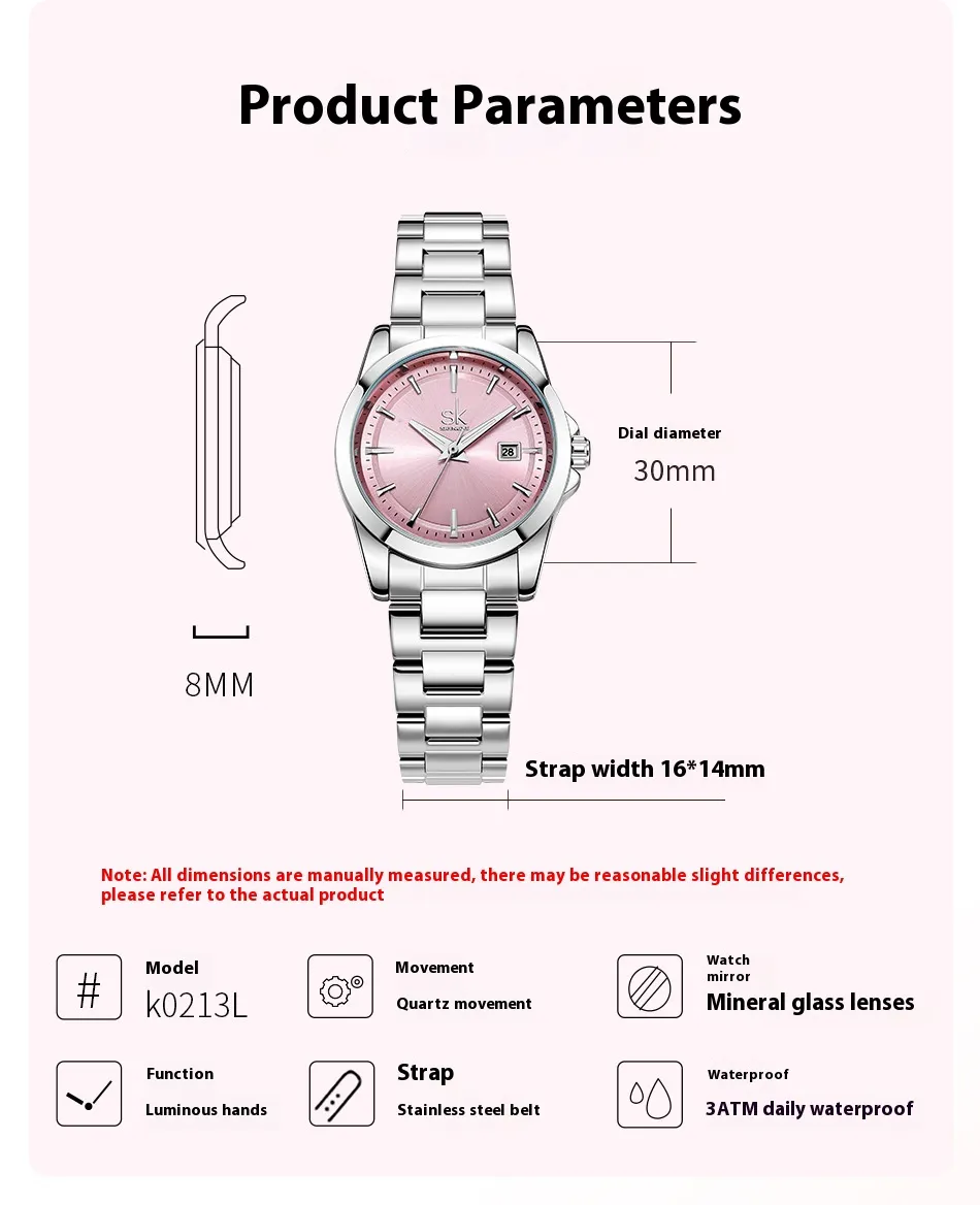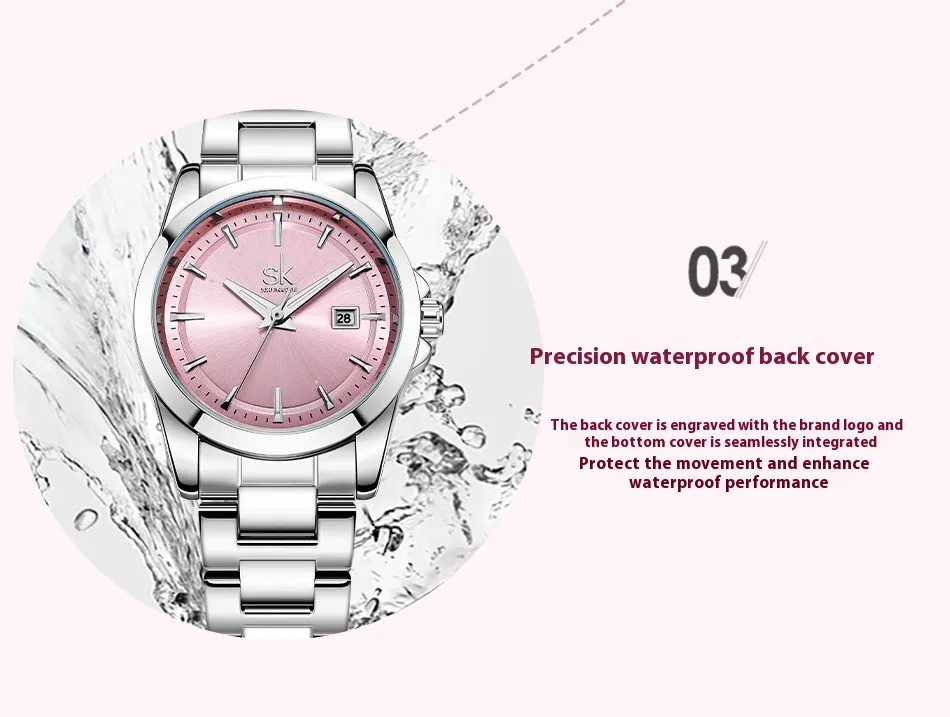 This watch is the perfect choice for women who value elegance, durability, and reliability. The waterproof feature ensures that it can handle various weather conditions, while the high-grade stainless steel construction guarantees that it will remain in excellent condition for years. The precise quartz movement provides accuracy, and the adjustable bracelet ensures comfort and a personalized fit. Whether you need a watch for daily use, sports, or formal events, this timepiece is a versatile addition to any wardrobe.