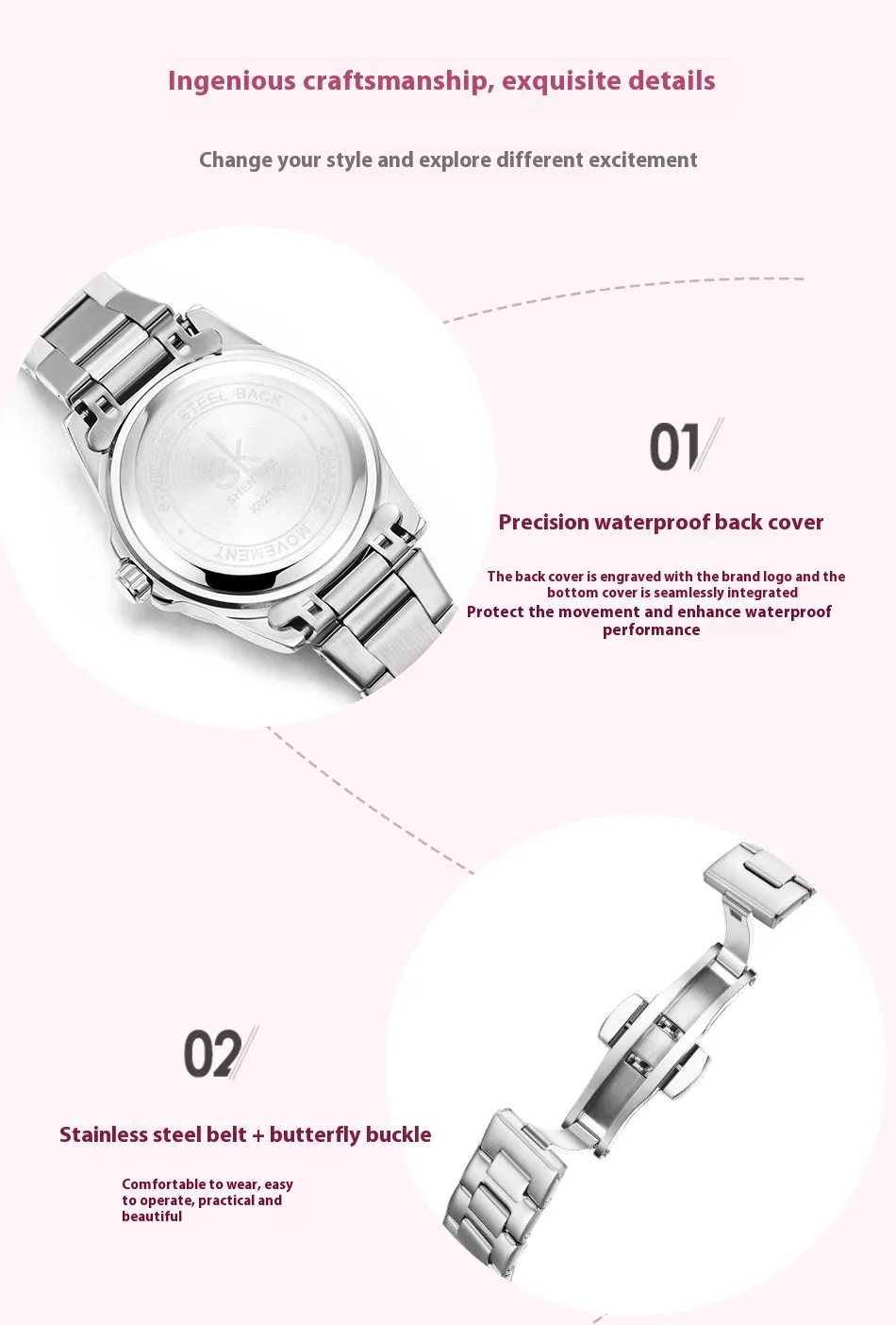 The Waterproof High-Grade Stainless Steel Women's Watch is the perfect combination of style, durability, and functionality. Designed for modern women who value both luxury and practicality, this timepiece offers a stainless steel construction that ensures long-lasting durability, while its waterproof feature provides the peace of mind that your watch will withstand the elements. Whether you're at the office, enjoying outdoor activities, or attending a special event, this watch is the ultimate accessory for those who want a reliable yet elegant timepiece.